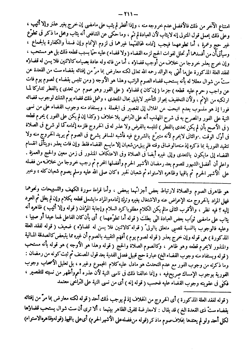 امْتِنَاعُ الْآخَرِ مِنْ ذَلِكَ فَالْأَفْضَلُ عَدَمُ خُرُوجِهِ مِنْهُ، وَإِذَا أَفْطَرَ لَمْ يُثَبْ عَلَى مَا مَضَى إنْ خَرَجَ بِغَيْرِ عُذْرٍ وَإِلَّا أُثِيبَ، وَعَلَى ذَلِكَ يُحْمَلُ قَوْلُ الْمُتَوَلِّي إنَّهُ لَا يُثَابُ لِأَنَّ الْعِبَادَةَ لَمْ تَتِمَّ، وَمَا حُكِيَ عَنْ الشَّافِعِيِّ أَنَّهُ يُثَابُ وَمَحَلُّ مَا ذُكِرَ فِي تَطَوُّعِ غَيْرِ حَجٍّ وَعُمْرَةٍ، أَمَّا تَطَوُّعُهُمَا فَيَجِبُ إتْمَامُهُ لِمُخَالَفَتِهِمَا غَيْرَهُمَا فِي لُزُومِ الْإِتْمَامِ وَإِنْ فَسَدَا وَالْكَفَّارَةُ بِالْجِمَاعِ، وَسَيَأْتِي أَنَّ مَنْ أَفْسَدَهُمَا أَوْ تَحَلَّلَ لِفَوَاتِ الْحَجِّ لَزِمَهُ الْقَضَاءُ (وَلَا قَضَاءَ) عَلَيْهِ حَتْمًا بِسَبَبِ قَطْعِهِ ذَلِكَ بَلْ هُوَ مُسْتَحَبٌّ، وَإِنْ خَرَجَ بِعُذْرٍ خُرُوجًا مِنْ خِلَافِ مَنْ أَوْجَبَ قَضَاءَهُ، أَمَّا مَنْ فَاتَهُ وَلَهُ عَادَةٌ بِصِيَامِهِ كَالِاثْنَيْنِ فَلَا يُسَنُّ لَهُ قَضَاؤُهُ لِفَقْدِ الْعِلَّةِ الْمَذْكُورَةِ عَلَى مَا أَفْتَى بِهِ الْوَالِدُ - رَحِمَهُ اللَّهُ تَعَالَى - لَكِنَّهُ مُعَارَضٌ بِمَا مَرَّ مِنْ إفْتَائِهِ بِقَضَاءِ سِتٍّ مِنْ الْقَعْدَةِ عَنْ سِتٍّ مِنْ شَوَّالٍ مُعَلِّلًا لَهُ بِأَنَّهُ يُسْتَحَبُّ قَضَاءُ الصَّوْمِ الرَّاتِبِ وَهَذَا هُوَ الْأَوْجَهُ.