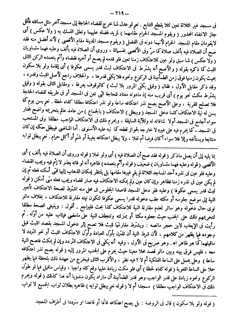 ـــــــــــــــــــــــــــــSبِمَا يَلِيهِ إلَى أَنْ يَصِلَ مَا ذُكِرَ (قَوْلُهُ: فَقَدْ صَحَّ أَنَّ الصَّلَاةَ فِيهِ) أَيْ وَلَوْ نَفْلًا (قَوْلُهُ: وَرُوِيَ أَنَّ الصَّلَاةَ فِيهِ بِأَلْفٍ) أَيْ الْأَقْصَى (قَوْلُهُ وَعَلَيْهِ فَهُمَا مُتَسَاوِيَانِ) ضَعِيفٌ (قَوْلُهُ: وَأَثِمَ بِتَعَمُّدِهِ) ظَاهِرُهُ أَنَّهُ لَوْ فَاتَهُ بِعُذْرٍ لَا إثْمَ فِيهِ وَيَجِبُ الْقَضَاءُ وَعَلَيْهِ فَلَوْ عَيَّنَ فِي نَذْرِهِ أَحَدَ الْمَسَاجِدِ الثَّلَاثَةِ لَمْ يَقُمْ غَيْرُهَا مَقَامَهَا بَلْ يَنْتَظِرُ إمْكَانَ الذَّهَابِ إلَيْهَا فَمَتَى أَمْكَنَهُ فِعْلُهُ ثُمَّ إنْ لَمْ يَكُنْ عَيَّنَ فِي نَذْرِهِ زَمَنًا فَظَاهِرٌ وَإِنْ كَانَ عَيَّنَ وَلَمْ يُمْكِنْهُ الِاعْتِكَافُ فِيهِ صَارَ قَضَاءً وَيَجِبُ فِعْلُهُ مَتَى أَمْكَنَ (قَوْلُهُ: لَبِثَ قَدْرًا يُسَمَّى عُكُوفًا) وَعَلَيْهِ فَلَوْ دَخَلَ الْمَسْجِدَ قَاصِدًا الْجُلُوسَ فِي مَحَلٍّ مِنْهُ اُشْتُرِطَ لِصِحَّةِ الِاعْتِكَافِ تَأْخِيرُ النِّيَّةِ إلَى مَوْضِعِ جُلُوسِهِ أَوْ مُكْثِهِ عَقِبَ دُخُولِهِ قَدْرًا يُسَمَّى عُكُوفًا لِتَكُونَ نِيَّتُهُ مُقَارِنَةً لِلِاعْتِكَافِ، بِخِلَافِ مَا لَوْ نَوَى حَالَ دُخُولِهِ وَهُوَ سَائِرٌ لِعَدَمِ مُقَارَنَةِ النِّيَّةِ لِلِاعْتِكَافِ كَذَا بُحِثَ فَلْيُرَاجَعْ. أَقُولُ: وَيَنْبَغِي الصِّحَّةُ مُطْلَقًا لِتَحْرِيمِهِمْ ذَلِكَ عَلَى الْجُنُبِ حَيْثُ جَعَلُوهُ مُكْثًا أَوْ بِمَنْزِلَتِهِ وَتَنْعَطِفُ النِّيَّةُ عَلَى مَا مَضَى فَيُثَابُ عَلَيْهِ مِنْ أَوَّلِهِ. ثُمَّ رَأَيْت فِي الْإِيعَابِ لِابْنِ حَجَرٍ مَا نَصُّهُ: وَيُشْتَرَطُ مُقَارَنَتُهَا لِلُّبْثِ فَلَا تَصِحُّ إثْرَ دُخُولِ الْمَسْجِدِ بِقَصْدِ اللُّبْثِ قَبْلَ وُجُودِهِ فِيمَا يَظْهَرُ مِنْ كَلَامِهِمْ، لِأَنَّ شَرْطَ النِّيَّةِ أَنَّ تَقْتَرِنَ بِأَوَّلِ الْعِبَادَةِ وَأَوَّلُ الِاعْتِكَافِ اللُّبْثُ أَوْ نَحْوُ التَّرَدُّدِ لَا مَا قَبْلَهُمَا كَمَا هُوَ ظَاهِرٌ اهـ. وَهُوَ صَرِيحٌ فِي الْأَوَّلِ، وَفِيهِ أَنَّهُ يَكْفِي فِي الِاعْتِكَافِ التَّرَدُّدُ وَإِنْ لَمْ يَمْكُثْ فَتَصِحُّ النِّيَّةُ مَعَهُ، فَلَيْسَ فَرْقٌ بَيْنَهُ وَبَيْنَ مَا لَوْ قَصَدَ مَحَلًّا مُعَيَّنًا حَيْثُ يَحْرُمُ عَلَى الْجُنُبِ الْمُرُورُ إلَيْهِ (قَوْلُهُ: يَصِحُّ نَذْرُ اعْتِكَافِهِ سَاعَةً) وَهَلْ يُحْمَلُ عَلَى السَّاعَةِ الْفَلَكِيَّةِ أَمْ لَا؟ فِيهِ نَظَرٌ، وَالْأَقْرَبُ الثَّانِي فَيَخْرُجُ مِنْ عُهْدَةِ ذَلِكَ بِلَحْظَةٍ فِيمَا يَظْهَرُ حَمْلًا عَلَى السَّاعَةِ اللُّغَوِيَّةِ (قَوْلُهُ: كَفَاهُ لَحْظَةٌ) أَيْ فَلَوْ مَكَثَ زِيَادَةً عَلَيْهَا وَقَعَ كُلُّهُ وَاجِبًا، وَقِيَاسُ مَا قِيلَ فِيمَا لَوْ طَوَّلَ الرُّكُوعَ وَنَحْوُهُ زِيَادَةٌ عَلَى قَدْرِ الْوَاجِبِ وَهُوَ قَدْرُ الطُّمَأْنِينَةِ أَنَّ مَا زَادَ يَكُونُ مَنْدُوبًا أَنَّهُ هُنَا كَذَلِكَ