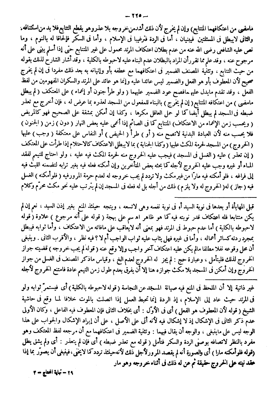 (قَوْلُهُ: عَلَى أَنَّهُ مَرْجُوعٌ) عِلَاوَةٌ (قَوْلُهُ: لَا حُبُوطَهُ بِالْكُلِّيَّةِ) أَمَّا عَدَمُ حُبُوطٍ فِي الْمُرْتَدِّ فَهُوَ بِمَعْنَى أَنَّهُ لَا يُعَاقَبُ عَلَى مَا فَاتَهُ مِنْ الِاعْتِكَافِ، وَأَمَّا ثَوَابُهُ فَيَبْطُلُ بِمُجَرَّدِ رِدَّتِهِ كَسَائِرِ أَعْمَالِهِ، وَأَمَّا فِي غَيْرِهِ فَهَلْ يُثَابُ عَلَيْهِ ثَوَابَ الْوَاجِبِ أَمْ لَا؟ فِيهِ نَظَرٌ، وَالْأَقْرَبُ الثَّانِي. وَيَنْبَغِي أَنَّ مَحَلَّ وُقُوعِهِ نَفْلًا مُطْلَقًا مَا لَمْ يَكُنْ عَلَيْهِ اعْتِكَافٌ آخَرُ وَاجِبٌ وَإِلَّا وَقَعَ عَنْهُ (قَوْلُهُ: لَمْ يَجِبْ خُرُوجُهُ) قَضِيَّتُهُ جَوَازُ الْخُرُوجِ لِذَلِكَ فَلْيُتَأَمَّلْ، وَعِبَارَةُ حَجّ: لَمْ يَجُزْ لَهُ الْخُرُوجُ لِعَدَمِ إلَخْ، وَقِيَاسُ مَا ذَكَرَ الْمُصَنِّفُ فِي الْغُسْلِ مِنْ جَوَازِ الْخُرُوجِ وَإِنْ أَمْكَنَ فِي الْمَسْجِدِ بِلَا مُكْثٍ جَوَازُهُ هُنَا إلَّا أَنْ يُفَرَّقَ بِعَدَمِ طُولِ زَمَنِ التَّيَمُّمِ عَادَةً فَامْتَنَعَ الْخُرُوجُ لِأَجْلِهِ