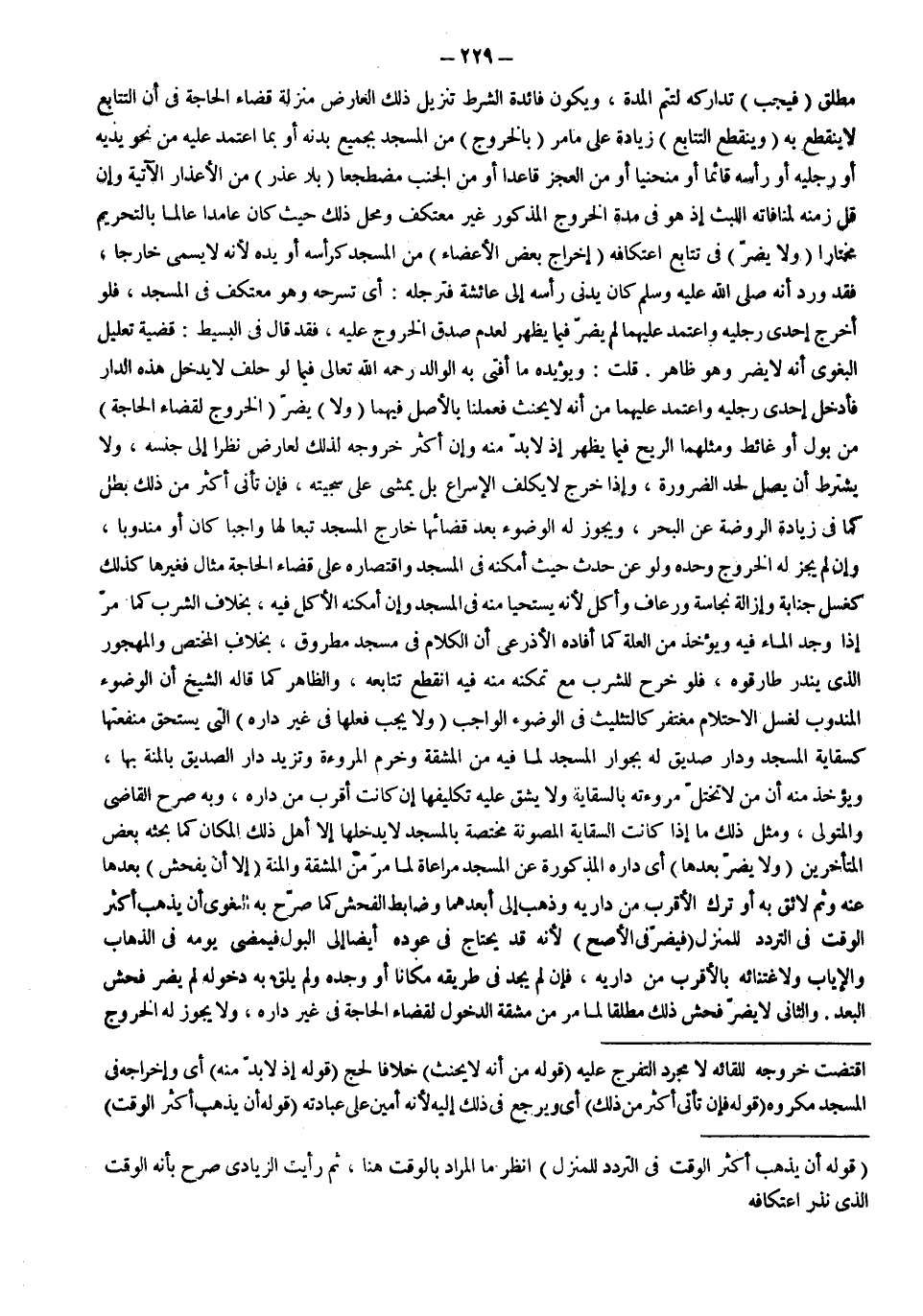 (قَوْلُهُ: إذْ لَا بُدَّ مِنْهُ) أَيْ وَإِخْرَاجُهُ فِي الْمَسْجِدِ مَكْرُوهٌ (قَوْلُهُ: فَإِنْ تَأَتَّى أَكْثَرُ مِنْ ذَلِكَ) أَيْ وَيَرْجِعُ فِي ذَلِكَ إلَيْهِ لِأَنَّهُ أَمِينٌ عَلَى عِبَادَتِهِ (قَوْلُهُ أَنْ يَذْهَبَ أَكْثَرُ الْوَقْتِ)