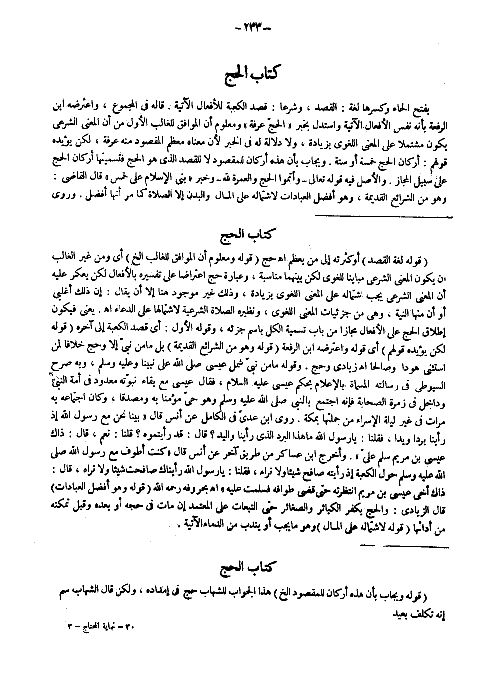 ِّ بِفَتْحِ الْحَاءِ وَكَسْرِهَا لُغَةً: الْقَصْدُ، وَشَرْعًا: قَصْدُ الْكَعْبَةِ لِلْأَفْعَالِ الْآتِيَةِ. قَالَهُ فِي الْمَجْمُوعِ، وَاعْتَرَضَهُ ابْنُ الرِّفْعَةِ بِأَنَّهُ نَفْسُ الْأَفْعَالِ الْآتِيَةِ وَاسْتَدَلَّ بِخَبَرِ: «الْحَجُّ عَرَفَةَ» وَمَعْلُومٌ أَنَّ الْمُوَافِقَ لِلْغَالِبِ الْأَوَّلِ مِنْ أَنَّ الْمَعْنَى الشَّرْعِيَّ يَكُونُ مُشْتَمِلًا عَلَى الْمَعْنَى اللُّغَوِيِّ بِزِيَادَةٍ، وَلَا دَلَالَةَ لَهُ فِي الْخَبَرِ؛ لِأَنَّ مَعْنَاهُ مُعْظَمُ الْمَقْصُودِ مِنْهُ عَرَفَةَ، لَكِنْ يُؤَيِّدُهُ قَوْلُهُمْ: أَرْكَانُ الْحَجِّ خَمْسَةٌ أَوْ سِتَّةٌ.