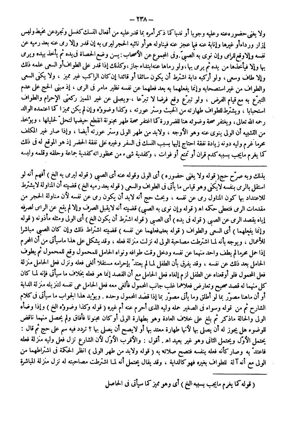 أَقُولُ: وَالْأَقْرَبُ الْأَوَّلُ لِأَنَّ الشَّارِعَ نَزَّلَ فِعْلَ وَلِيِّهِ مَنْزِلَةَ فِعْلِهِ فَاعْتَدَّ بِهِ وَصَارَ كَأَنَّهُ فَعَلَهُ بِنَفْسِهِ فَتَصِحُّ صَلَاتُهُ بِهِ (قَوْلُهُ: وَلَا بُدَّ مِنْ طُهْرِ الْوَلِيِّ) اُنْظُرْ الْحِكْمَةَ فِي اشْتِرَاطِهِمَا مِنْ الْوَلِيِّ مَعَ أَنَّهُ آلَةٌ لِلطَّوَافِ بِغَيْرِهِ فَهُوَ كَالدَّابَّةِ، وَقَدْ يُقَالُ يُحْتَمَلُ أَنَّهُ لَمَّا اُشْتُرِطَتْ مُصَاحَبَتُهُ لَهُ نَزَلَ مَنْزِلَةَ الْمُبَاشَرَةِ