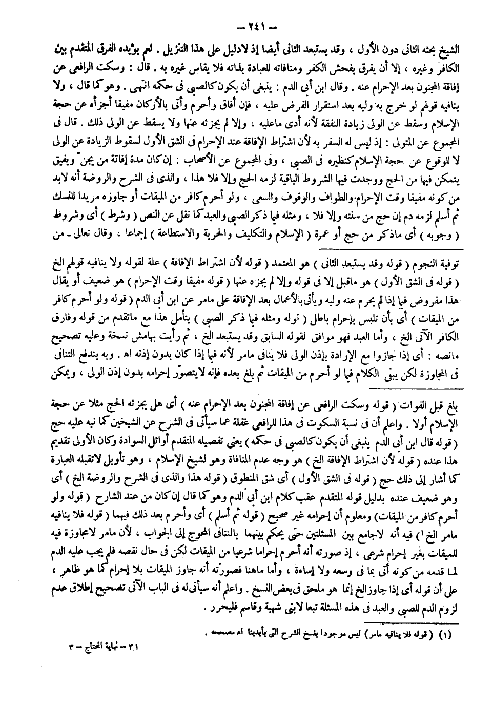 قَالَ: وَسَكَتَ الرَّافِعِيُّ عَنْ إفَاقَةِ الْمَجْنُونِ بَعْدَ الْإِحْرَامِ عَنْهُ وَقَالَ ابْنُ أَبِي الدَّمِ: يَنْبَغِي أَنْ يَكُونَ كَالصَّبِيِّ فِي حُكْمِهِ انْتَهَى. وَهُوَ كَمَا قَالَ، وَلَا يُنَافِيهِ قَوْلهمْ لَوْ خَرَجَ بِهِ وَلِيُّهُ بَعْدَ اسْتِقْرَارِ الْفَرْضِ عَلَيْهِ، فَإِنْ أَفَاقَ وَأَحْرَمَ وَأَتَى بِالْأَرْكَانِ مُفِيقًا أَجْزَأَهُ عَنْ حِجَّةِ الْإِسْلَامِ وَسَقَطَ عَنْ الْوَلِيِّ زِيَادَةُ النَّفَقَةِ؛ لِأَنَّهُ أَدَّى مَا عَلَيْهِ، وَإِلَّا لَمْ يُجْزِئْهُ عَنْهَا وَلَا يَسْقُطُ عَنْ الْوَلِيِّ ذَلِكَ قَالَ فِي الْمَجْمُوعِ عَنْ الْمُتَوَلِّي: إذْ لَيْسَ لَهُ السَّفَرُ بِهِ؛ لِأَنَّ اشْتِرَاطَ الْإِفَاقَةِ عِنْدَ الْإِحْرَامِ فِي الشِّقِّ الْأَوَّلِ لِسُقُوطِ الزِّيَادَةِ عَنْ الْوَلِيِّ لَا لِلْوُقُوعِ عَنْ حِجَّةِ الْإِسْلَامِ كَنَظِيرِهِ فِي الصَّبِيِّ، وَفِي الْمَجْمُوعِ عَنْ الْأَصْحَابِ: إنْ كَانَ مُدَّةُ إفَاقَةِ مَنْ يُجَنُّ وَيُفِيقُ يَتَمَكَّنُ فِيهَا مِنْ الْحَجِّ وَوُجِدَتْ فِيهَا الشُّرُوطُ الْبَاقِيَةُ لَزِمَهُ الْحَجُّ وَإِلَّا فَلَا هَذَا، وَاَلَّذِي فِي الشَّرْحِ وَالرَّوْضَةِ أَنَّهُ لَا بُدَّ مِنْ كَوْنِهِ مُفِيقًا وَقْتَ الْإِحْرَامِ وَالطَّوَافِ وَالْوُقُوفِ وَالسَّعْيِ.