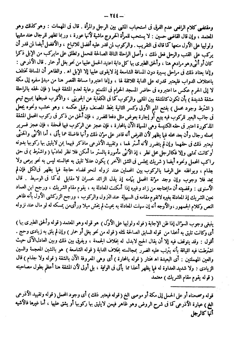 وَالظَّاهِرُ أَنَّ الْمَسَافَةَ تَخْتَلِفُ بِاخْتِلَافِ الدَّوَابِّ فَلْيُعْتَبَرْ قُدْرَتُهُ عَلَى الدَّابَّةِ اللَّائِقَةِ لَهَا، وَإِنَّمَا اعْتَبَرُوا مَسَافَةَ الْقَصْرِ هُنَا مِنْ مَبْدَإِ سَفَرِهِ إلَى مَكَّةَ لَا إلَى الْحَرَمِ عَكْسَ مَا اعْتَبَرُوهُ فِي حَاضِرِ الْمَسْجِدِ الْحَرَامِ فِي الْمُتَمَتِّعِ رِعَايَةً لِعَدَمِ الْمَشَقَّةِ فِيهِمَا (فَإِنْ لَحِقَهُ بِالرَّاحِلَةِ مَشَقَّةٌ شَدِيدَةٌ) بِأَنْ تَكُونَ كَالْمَشَقَّةِ بَيْنَ الْمَشْيِ وَالرُّكُوبِ كَمَا فِي الْكِفَايَةِ عَنْ الْجُوَيْنِيِّ، وَالْأَقْرَبُ ضَبْطُهَا بِمُبِيحِ تَيَمُّمٍ (اُشْتُرِطَ وُجُودُ مَحْمِلٍ) بِفَتْحِ الْمِيمِ الْأُولَى وَكَسْرِ الثَّانِيَةِ بِخَطِّ الْمُصَنِّفِ وَقِيلَ عَكْسُهُ، وَهُوَ خَشَبٌ وَنَحْوُهُ يُجْعَلُ فِي جَانِبِ الْبَعِيرِ لِلرُّكُوبِ فِيهِ بِبَيْعٍ أَوْ إجَارَةٍ بِعِوَضِ مِثْلٍ دَفْعًا لِلضَّرَرِ، فَإِنْ أُلْحِقَ مَنْ ذُكِرَ فِي رُكُوبِ الْمَحْمِلِ الْمَشَقَّةُ الْمَذْكُورَةُ اُعْتُبِرَ فِي حَقِّهِ الْكَنِيسَةُ، وَهِيَ الْمُسَمَّاةُ الْآنَ بِالْمَحَارَةِ، فَإِنْ عَجَزَ عَنْ الرُّكُوبِ فِيهَا فَمِحَفَّةٌ، فَإِنْ عَجَزَ فَسَرِيرٌ يَحْمِلُهُ رِجَالٌ وَإِنْ بَعُدَ مَحَلُّهُ فِيمَا يَظْهَرُ؛ لِأَنَّ الْفَرْضَ أَنَّهُ قَادِرٌ عَلَى مُؤَنِ ذَلِكَ، وَأَنَّهَا فَاضِلَةٌ عَمَّا يَأْتِي، أَمَّا الْأُنْثَى وَالْخُنْثَى فَيُعْتَبَرُ ذَلِكَ فِي حَقِّهِمَا وَإِنْ لَمْ يَتَضَرَّرْ؛ لِأَنَّهُ أَسْتَرُ لَهُمَا، وَتَقْيِيدُ الْأَذْرَعِيُّ مَا ذَكَرَ فِيهِمَا بِمَنْ لَا يَلِيقُ بِهَا رُكُوبُهَا بِدُونِهِ أَوْ كَانَتْ تَمَشَّى وَإِلَّا فَكَالرِّجْلِ مَحَلُّ نَظَرٍ، إذْ الْأُنْثَى مَأْمُورَةٌ بِالسِّتْرِ مَا أَمْكَنَ فَلَا نَظَرَ لِعَادَتِهَا (وَاشْتُرِطَ) فِي حَقِّ رَاكِبِ الْمَحْمِلِ وَنَحْوِهِ أَيْضًا (شَرِيكٌ يَجْلِسُ فِي الشِّقِّ الْآخَرِ) يَكُونُ عَدْلًا تَلِيقُ بِهِ مُجَالَسَتُهُ لَيْسَ بِهِ نَحْوُ بَرَصٍ وَلَا جُذَامٍ، وَيُوَافِقُهُ عَلَى الرِّضَا بِالرُّكُوبِ بَيْنَ الْمَحْمِلَيْنِ عِنْدَ نُزُولِهِ لِنَحْوِ قَضَاءِ حَاجَةٍ فِيمَا يَظْهَرُ فِي الْكُلِّ فَإِنْ لَمْ يَجِدْ فَلَا وُجُوبَ وَإِنْ وَجَدَ مُؤْنَةَ الْمَحْمِلِ بِتَمَامِهِ إذْ بَذْلُ الزَّائِدِ خُسْرَانٌ لَا مُقَابِلَ لَهُ كَمَا فِي الْوَسِيطِ.