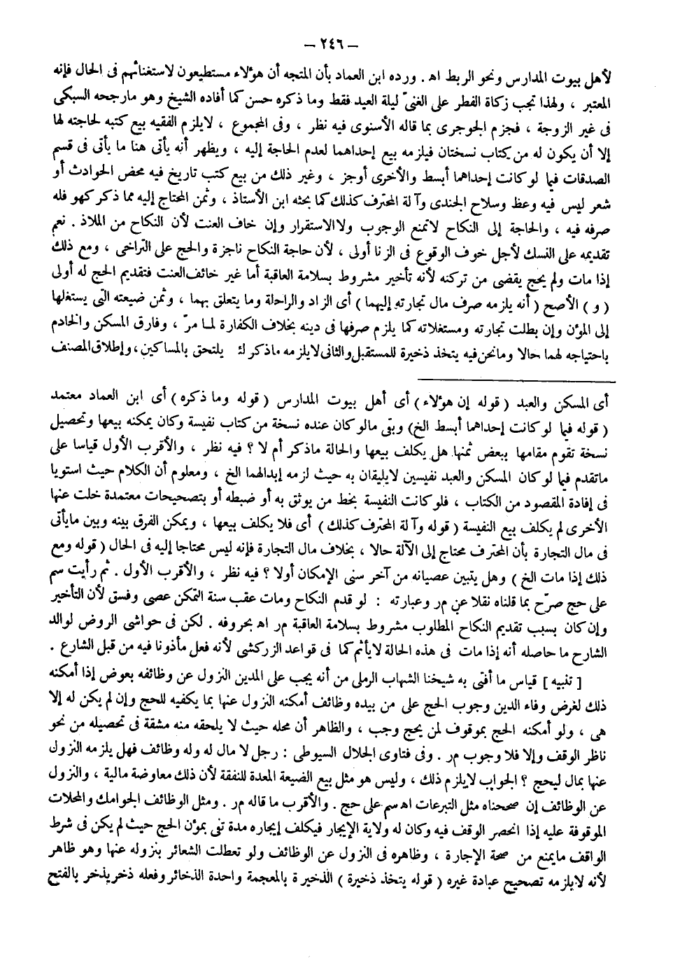 وَرَدَّهُ ابْنُ الْعِمَادِ بِأَنَّ الْمُتَّجَهَ أَنَّ هَؤُلَاءِ مُسْتَطِيعُونَ لِاسْتِغْنَائِهِمْ فِي الْحَالِ فَإِنَّهُ الْمُعْتَبَرُ، وَلِهَذَا تَجِبُ زَكَاةُ الْفِطْرِ عَلَى الْغَنِيِّ لَيْلَةَ الْعِيدِ فَقَطْ وَمَا ذَكَرَهُ حَسَنٌ كَمَا أَفَادَهُ الشَّيْخُ وَهُوَ مَا رَجَّحَهُ السُّبْكِيُّ فِي غَيْرِ الزَّوْجَةِ، فَجَزَمَ الْجَوْجَرِيُّ بِمَا قَالَهُ الْإِسْنَوِيُّ فِيهِ نَظَرٌ، وَفِي الْمَجْمُوعِ، لَا يَلْزَمُ الْفَقِيهَ بَيْعُ كُتُبِهِ لِحَاجَتِهِ لَهَا إلَّا أَنْ يَكُونَ لَهُ مِنْ كِتَابٍ نُسْخَتَانِ فَيَلْزَمُهُ بَيْعُ إحْدَاهُمَا لِعَدَمِ الْحَاجَةِ إلَيْهِ، وَيَظْهَرُ أَنَّهُ يَأْتِي هُنَا مَا يَأْتِي فِي قِسْمِ الصَّدَقَاتِ فِيمَا لَوْ كَانَتْ إحْدَاهُمَا أَبْسَطُ، وَالْأُخْرَى أَوْجَزُ، وَغَيْرُ ذَلِكَ مِنْ بَيْعِ كُتُبِ تَارِيخٍ فِيهِ مَحْضُ الْحَوَادِثِ أَوْ شِعْرٌ لَيْسَ فِيهِ وَعْظٌ وَسِلَاحُ الْجُنْدِيِّ وَآلَةُ الْمُحْتَرَفِ كَذَلِكَ كَمَا بَحَثَهُ ابْنُ الْأُسْتَاذِ، وَثَمَنُ الْمُحْتَاجِ إلَيْهِ مِمَّا ذَكَرَ كَهُوَ فَلَهُ صَرْفُهُ فِيهِ