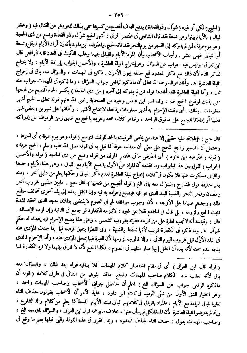 ـــــــــــــــــــــــــــــSقَالَ حَجّ: فَإِطْلَاقُهُ عَلَيْهِ حَقِيقِيٌّ إلَّا عِنْدَ مَنْ يَخُصُّ التَّوْقِيتَ بِالْحَدِّ لِلْوَقْتِ فَتُوَسِّعَ (قَوْلُهُ: وَهُوَ يَوْمُ عَرَفَةَ) أَيْ آخِرِهَا، وَيُحْتَمَلُ أَنَّ الضَّمِيرَ رَاجِعٌ لِلْحَجِّ عَلَى مَعْنَى أَنَّ مُعْظَمَهُ عَرَفَةُ كَمَا قِيلَ بِهِ فِي قَوْلِهِ - صَلَّى اللَّهُ عَلَيْهِ وَسَلَّمَ - «الْحَجُّ عَرَفَةَ» (قَوْلُهُ: وَاعْتَرَضَهُ ابْنُ دَاوُد) أَيْ اعْتَرَضَ مَا فِي مُخْتَصَرِ الْمُزَنِيّ مِنْ قَوْلِهِ وَتِسْعٌ مِنْ ذِي الْحِجَّةِ (قَوْلُهُ: وَالْأَحْسَنُ الْجَوَابُ) الْفَرْقُ بَيْنَ هَذَا الْجَوَابِ وَمَا تَقَدَّمَهُ أَنَّ الْمُرَادَ عَلَى الْأَوَّلِ بِالتِّسْعِ الْأَيَّامُ مَعَ اللَّيَالِيِ، وَعَلَى هَذَا الْأَيَّامُ وَحْدَهَا وَاللَّيَالِي مَسْكُوتٌ عَنْهَا فَلَا يَكُونُ فِي كَلَامِهِ إخْرَاجٌ لِلَّيْلَةِ الْعَاشِرَةِ لِعَدَمِ ذِكْرِ اللَّيَالِيِ وَحُكْمُهَا يُعْلَمُ مِنْ دَلِيلٍ آخَرَ، وَمِنْهُ يُعْلَمُ حَقِيقَةُ قَوْلِ الشَّارِحِ وَالسُّؤَالُ مَعَهُ بَاقٍ إلَخْ (قَوْلُهُ: أَفْصَحُ مِنْ فَتْحِهَا) قَالَ حَجّ: مَا بَيْنَ مُنْتَهَى غُرُوبِ آخَرِ رَمَضَانَ وَفَجْرُ النَّحْرِ بِالنِّسْبَةِ لِلْبَلَدِ الَّذِي هُوَ فِيهِ فَيَصِحُّ إحْرَامُهُ بِهِ فِيهِ وَإِنْ انْتَقَلَ بَعْدَهُ إلَى بَلَدٍ أُخْرَى تُخَالِفُ مَطْلِعَ تِلْكَ وَوَجَدَهُمْ صِيَامًا عَلَى الْأَوْجُهِ، لِأَنَّ وُجُوبُ مُوَافَقَتِهِ لَهُمْ فِي الصَّوْمِ لَا يَقْتَضِي بُطْلَانُ حَجِّهِ الَّذِي انْعَقَدَ لِشِدَّةِ تَثَبُّتِ الْحَجِّ وَلُزُومِهِ، بَلْ قَالَ فِي الْخَادِمِ نَقْلًا عَنْ غَيْرِهِ: لَا تَلْزَمُهُ الْكَفَّارَةُ لَوْ جَامَعَ فِي الثَّانِيَةِ وَإِنْ لَزِمَهُ الْإِمْسَاكُ.