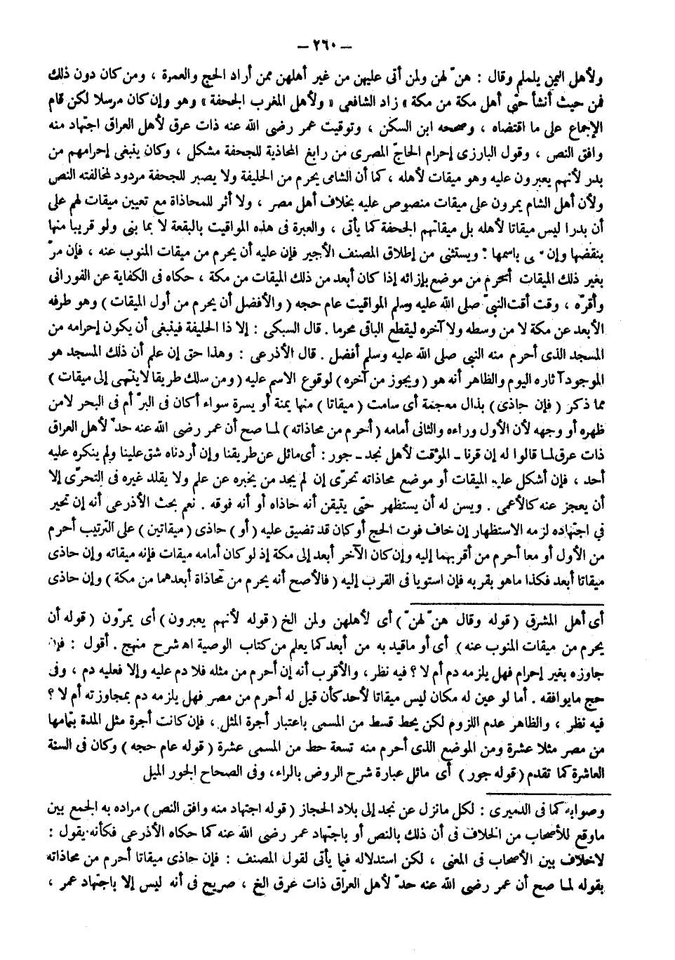 قَالَ السُّبْكِيُّ: إلَّا ذَا الْحُلَيْفَةِ فَيَنْبَغِي أَنْ يَكُونَ إحْرَامُهُ مِنْ الْمَسْجِدِ الَّذِي أَحْرَمَ مِنْهُ النَّبِيُّ - صَلَّى اللَّهُ عَلَيْهِ وَسَلَّمَ - أَفْضَلُ. قَالَ الْأَذْرَعِيُّ: وَهَذَا حَقٌّ إنْ عَلِمَ أَنَّ ذَلِكَ الْمَسْجِدَ هُوَ الْمَوْجُودُ آثَارُهُ الْيَوْمَ وَالظَّاهِرُ أَنَّهُ هُوَ (وَيَجُوزُ مِنْ آخِرِهِ) لِوُقُوعِ الِاسْمِ عَلَيْهِ (وَمَنْ سَلَكَ طَرِيقًا لَا يَنْتَهِي إلَى مِيقَاتٍ) مِمَّا ذُكِرَ (فَإِنْ حَاذَى) بِذَالٍ مُعْجَمَةٍ أَيْ سَامَتَ (مِيقَاتًا) مِنْهَا يَمْنَةً أَوْ يَسْرَةً سَوَاءٌ أَكَانَ فِي الْبَرِّ أَمْ فِي الْبَحْرِ لَا مِنْ ظَهْرِهِ أَوْ وَجْهِهِ؛ لِأَنَّ الْأَوَّلَ وَرَاءَهُ وَالثَّانِي أَمَامَهُ (أَحْرَمَ مِنْ مُحَاذَاتِهِ) لِمَا صَحَّ أَنَّ عُمَرَ - رَضِيَ اللَّهُ عَنْهُ - حَدَّ لِأَهْلِ الْعِرَاقِ ذَاتَ عِرْقٍ لَمَّا قَالُوا لَهُ: إنَّ قَرْنًا الْمُؤَقَّتُ لِأَهْلِ نَجْدٍ جَوْرٌ: أَيْ مَائِلٌ عَنْ طَرِيقِنَا وَإِنْ أَرَدْنَاهُ شَقَّ عَلَيْنَا وَلَمْ يُنْكِرْهُ عَلَيْهِ أَحَدٌ، فَإِنْ أَشْكَلَ عَلَيْهِ الْمِيقَاتُ أَوْ مَوْضِعُ مُحَاذَاتِهِ تَحَرَّى إنْ لَمْ يَجِدْ مَنْ يُخْبِرُهُ عَنْ عِلْمٍ وَلَا يُقَلِّدُ غَيْرَهُ فِي التَّحَرِّي إلَّا أَنْ يَعْجِزَ عَنْهُ كَالْأَعْمَى.