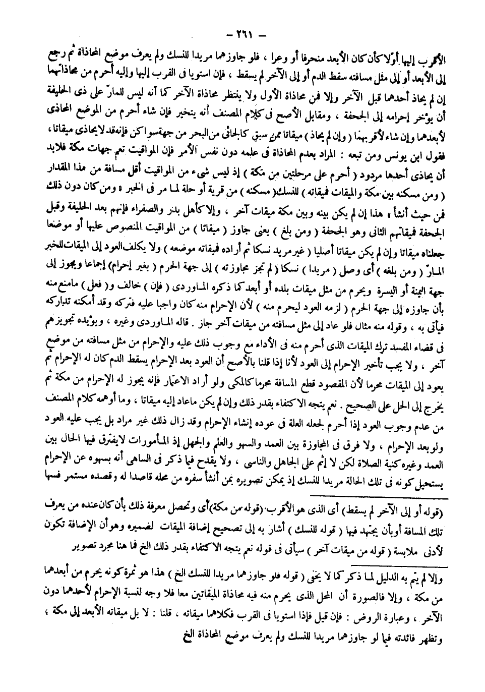 الْأَقْرَبَ إلَيْهَا أَوَّلًا كَأَنْ كَانَ الْأَبْعَدُ مُنْحَرِفًا أَوْ وَعِرًا، فَلَوْ جَاوَزَهُمَا مُرِيدًا لِلنُّسُكِ وَلَمْ يَعْرِفْ مَوْضِعَ الْمُحَاذَاةِ ثُمَّ رَجَعَ إلَى الْأَبْعَدِ أَوْ إلَى مِثْلِ مَسَافَتِهِ سَقَطَ الدَّمُ أَوْ إلَى الْآخِرِ لَمْ يَسْقُطْ، فَإِنْ اسْتَوَيَا فِي الْقُرْبِ إلَيْهَا وَإِلَيْهِ أَحْرَمَ مِنْ مُحَاذَاتِهَا إنْ لَمْ يُحَاذِ أَحَدُهُمَا قَبْلَ الْآخِرِ وَإِلَّا فَمِنْ مُحَاذَاةِ الْأَوَّلِ وَلَا يَنْتَظِرُ مُحَاذَاةَ الْآخِرِ كَمَا أَنَّهُ لَيْسَ لِلْمَارِّ عَلَى ذِي الْحُلَيْفَةِ أَنْ يُؤَخِّرَ إحْرَامَهُ إلَى الْجُحْفَةِ، وَمُقَابِلُ الْأَصَحِّ فِي كَلَامِ الْمُصَنِّفِ أَنَّهُ يَتَخَيَّرُ فَإِنْ شَاءَ أَحْرَمَ مِنْ الْمَوْضِعِ الْمُحَاذِي لِأَبْعَدِهِمَا وَإِنْ شَاءَ لِأَقْرَبِهِمَا.
