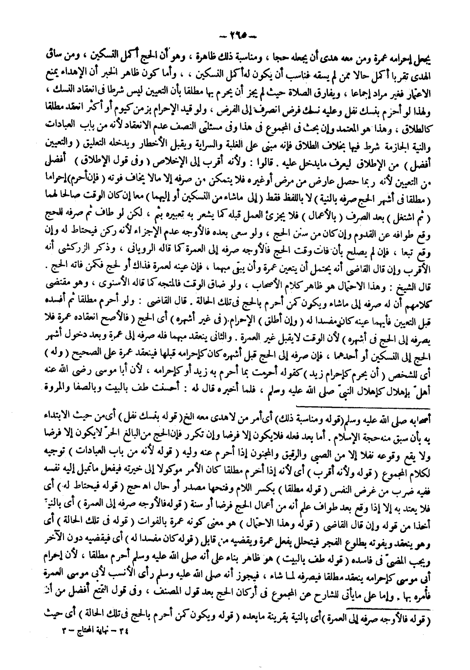 يَجْعَلَ إحْرَامَهُ عُمْرَةً وَمَنْ مَعَهُ هَدْيٌ أَنْ يَجْعَلَهُ حَجًّا» ، وَمُنَاسَبَةُ ذَلِكَ ظَاهِرَةٌ، وَهُوَ أَنَّ الْحَجَّ أَكْمَلُ النُّسُكَيْنِ، وَمَنْ سَاقَ الْهَدْيَ تَقَرُّبًا أَكْمَلُ حَالًا مِمَّنْ لَمْ يَسُقْهُ فَنَاسَبَ أَنْ يَكُونَ لَهُ أَكْمَلُ النُّسُكَيْنِ، وَأَمَّا كَوْنُ ظَاهِرِ الْخَبَرِ أَنَّ الْإِهْدَاءَ يَمْنَعُ الِاعْتِمَارَ فَغَيْرُ مُرَادٍ إجْمَاعًا، وَيُفَارِقُ الصَّلَاةَ حَيْثُ لَمْ يَجُزْ أَنْ يُحْرِمَ بِهَا مُطْلَقًا بِأَنَّ التَّعْيِينَ لَيْسَ شَرْطًا فِي انْعِقَادِ النُّسُكِ، وَلِهَذَا لَوْ أَحْرَمَ بِنُسُكِ نَفْلٍ وَعَلَيْهِ نُسُكُ فَرْضٍ انْصَرَفَ إلَى الْفَرْضِ، وَلَوْ قَيَّدَ الْإِحْرَامَ بِزَمَنٍ كَيَوْمٍ أَوْ أَكْثَرَ انْعَقَدَ مُطْلَقًا كَالطَّلَاقِ، وَهَذَا هُوَ الْمُعْتَمَدُ وَإِنْ بَحَثَ فِي الْمَجْمُوعِ فِي هَذَا وَفِي مَسْأَلَتَيْ النِّصْفِ عَدَمُ الِانْعِقَادِ؛ لِأَنَّهُ مِنْ بَابِ الْعِبَادَاتِ وَالنِّيَّةُ الْجَازِمَةُ شَرْطٌ فِيهَا بِخِلَافِ الطَّلَاقِ فَإِنَّهُ مَبْنِيٌّ عَلَى الْغَلَبَةِ وَالسِّرَايَةِ وَيَقْبَلُ الْأَخْطَارَ وَيَدْخُلُهُ التَّعْلِيقُ.