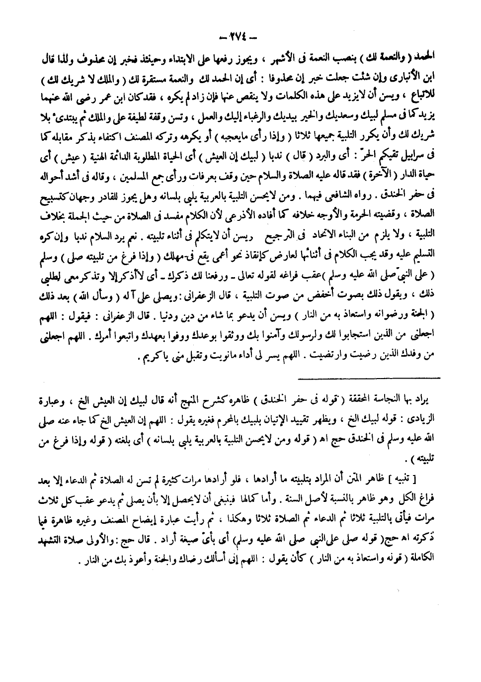 الْحَمْدَ (وَالنِّعْمَةَ لَكَ) بِنَصْبِ النِّعْمَةِ فِي الْأَشْهَرِ، وَيَجُوزُ رَفْعُهَا عَلَى الِابْتِدَاءِ وَحِينَئِذٍ فَخَبَرُ إنَّ مَحْذُوفٌ وَلِذَا قَالَ ابْنُ الْأَنْبَارِيُّ وَإِنْ شِئْت جَعَلْت خَبَرَ إنَّ مَحْذُوفًا: أَيْ إنَّ الْحَمْدَ لَكَ وَالنِّعْمَةَ مُسْتَقِرَّةٌ لَكَ (وَالْمُلْكَ لَا شَرِيكَ لَك) لِلِاتِّبَاعِ، وَيُسَنُّ أَنْ لَا يَزِيدَ عَلَى هَذِهِ الْكَلِمَاتِ وَلَا يَنْقُصُ عَنْهَا فَإِنْ زَادَ لَمْ يُكْرَهْ، فَقَدْ كَانَ ابْنُ عُمَرَ - رَضِيَ اللَّهُ عَنْهُمَا - يَزِيدُ كَمَا فِي مُسْلِمٍ لَبَّيْكَ وَسَعْدَيْكَ وَالْخَيْرُ بِيَدَيْك وَالرَّغْبَاءُ إلَيْك وَالْعَمَلُ، وَتُسَنُّ وَقْفَةٌ لَطِيفَةٌ عَلَى وَالْمُلْكَ، ثُمَّ يَبْتَدِئُ بِلَا شَرِيكَ لَكَ وَأَنْ يُكَرِّرَ التَّلْبِيَةَ جَمِيعَهَا ثَلَاثًا (وَإِذَا رَأَى مَا يُعْجِبُهُ) أَوْ يَكْرَهُهُ وَتَرَكَهُ الْمُصَنِّفُ اكْتِفَاءً بِذِكْرِ مُقَابِلِهِ كَمَا فِي {سَرَابِيلَ تَقِيكُمُ الْحَرَّ} [النحل: 81] أَيْ وَالْبَرْدَ (قَالَ) نَدْبًا (لَبَّيْكَ إنَّ الْعَيْشَ) أَيْ الْحَيَاةَ الْمَطْلُوبَةَ الدَّائِمَةَ الْهَنِيَّةَ (عَيْشُ) أَيْ حَيَاةُ الدَّارِ (الْآخِرَةِ) فَقَدْ قَالَهُ - عَلَيْهِ الصَّلَاةُ وَالسَّلَامُ - حِينَ وَقَفَ بِعَرَفَاتٍ وَرَأَى جَمْعَ الْمُسْلِمِينَ، وَقَالَهُ فِي أَشَدِّ أَحْوَالِهِ فِي حَفْرِ الْخَنْدَقِ رَوَاهُ الشَّافِعِيُّ فِيهِمَا. .