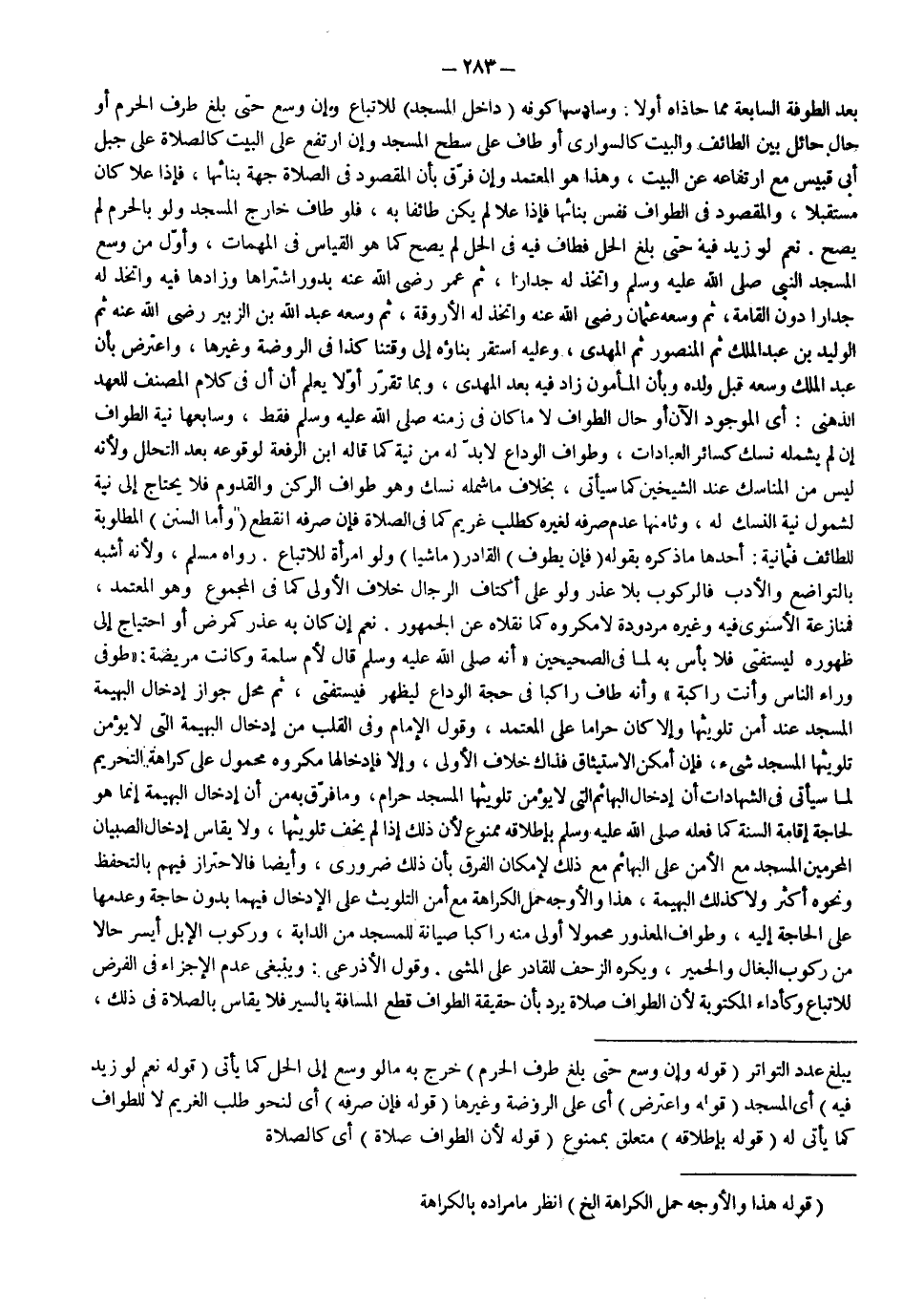 نَعَمْ لَوْ زِيدَ فِيهِ حَتَّى بَلَغَ الْحِلَّ فَطَافَ فِيهِ فِي الْحِلِّ لَمْ يَصِحَّ كَمَا هُوَ الْقِيَاسُ فِي الْمُهِمَّاتِ، «وَأَوَّلُ مَنْ وَسَّعَ الْمَسْجِدَ النَّبِيُّ - صَلَّى اللَّهُ عَلَيْهِ وَسَلَّمَ - وَاِتَّخَذَ لَهُ جِدَارًا، ثُمَّ عُمَرُ - رَضِيَ اللَّهُ عَنْهُ - بِدُورٍ اشْتَرَاهَا وَزَادَهَا فِيهِ وَاتَّخَذَ لَهُ جِدَارًا دُونَ الْقَامَةِ، ثُمَّ وَسَّعَهُ عُثْمَانُ - رَضِيَ اللَّهُ عَنْهُ - وَاِتَّخَذَ لَهُ الْأَرْوِقَةَ، ثُمَّ وَسَّعَهُ عَبْدُ اللَّهِ بْنُ الزُّبَيْرِ - رَضِيَ اللَّهُ عَنْهُ - ثُمَّ الْوَلِيدُ بْنُ عَبْدِ الْمَلِكِ ثُمَّ الْمَنْصُورُ ثُمَّ الْمَهْدِيُّ» ، وَعَلَيْهِ اسْتَقَرَّ بِنَاؤُهُ إلَى وَقْتِنَا كَذَا فِي الرَّوْضَةِ وَغَيْرِهَا، وَاعْتَرَضَ بِأَنَّ عَبْدَ الْمَلِكِ وَسَّعَهُ قَبْلَ وَلَدِهِ وَبِأَنَّ الْمَأْمُونَ زَادَ فِيهِ بَعْدَ الْمَهْدِيِّ، وَبِمَا تَقَرَّرَ أَوَّلًا يُعْلَمُ أَنَّ أَلْ فِي كَلَامِ الْمُصَنِّفِ لِلْعَهْدِ الذِّهْنِيِّ: أَيْ الْمَوْجُودِ الْآنَ أَوْ حَالَ الطَّوَافِ لَا مَا كَانَ فِي زَمَنِهِ - صَلَّى اللَّهُ عَلَيْهِ وَسَلَّمَ - فَقَطْ.