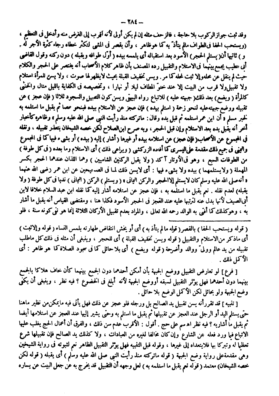 (قَوْلُهُ: وَإِلَّا ثَبَتَ) أَيْ مَا ذُكِرَ مِنْ الِاسْتِلَامِ وَالتَّقْبِيلِ (قَوْلُهُ: وَيُسَنُّ تَخْفِيفُ الْقِبْلَةِ) أَيْ لِلْحَجَرِ، وَيَنْبَغِي أَنَّ مِثْلَهُ فِي ذَلِكَ كُلُّ مَا طُلِبَ تَقْبِيلُهُ مِنْ يَدِ عَالِمٍ وَوَلِيٍّ وَوَالِدٍ وَأَضْرِحَةٍ (قَوْلُهُ: وَيَضَعُ) أَيْ بِلَا حَائِلٍ كَمَا فِي سُجُودِ الصَّلَاةِ كَمَا هُوَ ظَاهِرٌ: أَيْ الْأَكْمَلُ ذَلِكَ. [فَرْعٌ]