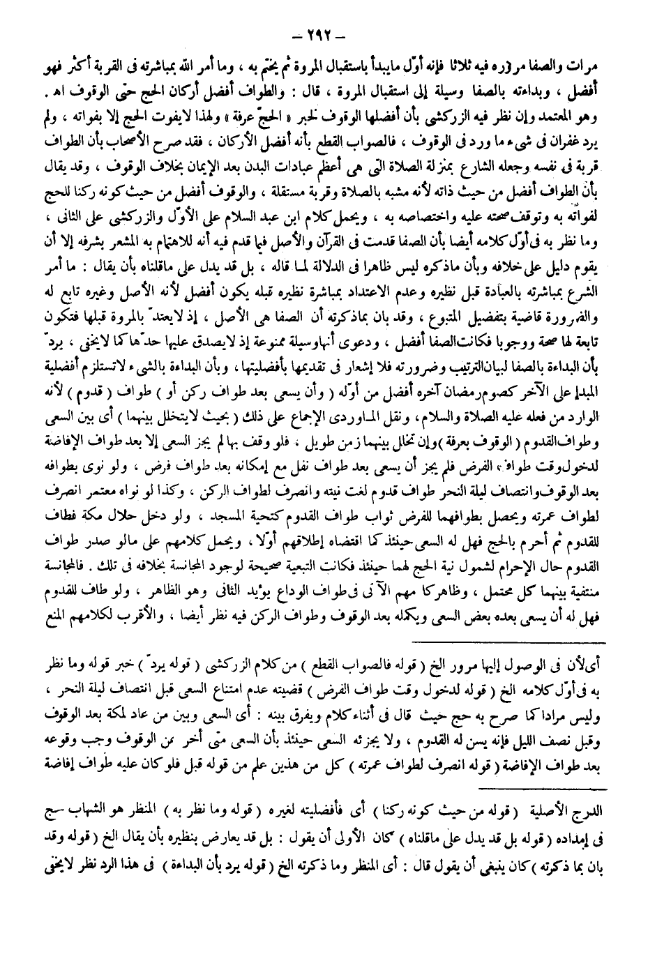 مَرَّاتٍ وَالصَّفَا مُرُورُهُ فِيهِ ثَلَاثًا فَإِنَّهُ أَوَّلُ مَا يَبْدَأُ بِاسْتِقْبَالِ الْمَرْوَةِ ثُمَّ يَخْتِمُ بِهِ، وَمَا أَمَرَ اللَّهُ بِمُبَاشَرَتِهِ فِي الْقُرْبَةِ أَكْثَرُ فَهُوَ أَفْضَلُ، وَبُدَاءَتُهُ بِالصَّفَا وَسِيلَةٌ إلَى اسْتِقْبَالِ الْمَرْوَةِ، قَالَ: وَالطَّوَافُ أَفْضَلُ أَرْكَانِ الْحَجِّ حَتَّى الْوُقُوفَ اهـ. وَهُوَ الْمُعْتَمَدُ وَإِنْ نَظَرَ فِيهِ الزَّرْكَشِيُّ بِأَنَّ أَفْضَلَهَا الْوُقُوفُ لِخَبَرِ «الْحَجُّ عَرَفَةَ» وَلِهَذَا لَا يَفُوتُ الْحَجُّ إلَّا بِفَوَاتِهِ، وَلَمْ يَرِدْ غُفْرَانٌ فِي شَيْءٍ مَا وَرَدَ فِي الْوُقُوفِ، فَالصَّوَابُ الْقَطْعُ بِأَنَّهُ أَفْضَلُ الْأَرْكَانِ، فَقَدْ صَرَّحَ الْأَصْحَابُ بِأَنَّ الطَّوَافَ قُرْبَةٌ فِي نَفْسِهِ وَجُمَلُهُ الشَّارِعِ بِمَنْزِلَةِ الصَّلَاةِ الَّتِي هِيَ أَعْظَمُ عِبَادَاتِ الْبَدَنِ بَعْدَ الْإِيمَانِ بِخِلَافِ الْوُقُوفِ، وَقَدْ يُقَالُ بِأَنَّ الطَّوَافَ أَفْضَلُ مِنْ حَيْثُ ذَاتِهِ؛ لِأَنَّهُ مُشَبَّهٌ بِالصَّلَاةِ وَقُرْبَةٌ مُسْتَقِلَّةٌ، وَالْوُقُوفُ أَفْضَلُ مِنْ حَيْثُ كَوْنِهِ رُكْنًا لِلْحَجِّ لِفَوَاتِهِ بِهِ وَتَوَقُّفِ صِحَّتِهِ عَلَيْهِ وَاخْتِصَاصِهِ بِهِ، وَيُحْمَلُ كَلَامُ ابْنِ عَبْدِ السَّلَامِ عَلَى الْأَوَّلِ وَالزَّرْكَشِيِّ عَلَى الثَّانِي، وَمَا نَظَرَ بِهِ فِي أَوَّلِ كَلَامِهِ أَيْضًا بِأَنَّ الصَّفَا قُدِّمَتْ فِي الْقُرْآنِ وَالْأَصْلُ فِيمَا قُدِّمَ فِيهِ أَنَّهُ لِلِاهْتِمَامِ بِهِ الْمُشْعِرِ بِشَرَفِهِ إلَّا أَنْ يَقُومَ دَلِيلٌ عَلَى خِلَافِهِ وَبِأَنَّ مَا ذَكَرَهُ لَيْسَ ظَاهِرًا فِي الدَّلَالَةِ لِمَا قَالَهُ، بَلْ قَدْ يَدُلُّ عَلَى مَا قُلْنَاهُ بِأَنْ يُقَالَ: مَا أَمَرَ الشَّرْعُ بِمُبَاشَرَتِهِ بِالْعِبَادَةِ قَبْلَ نَظِيرِهِ وَعَدَمِ الِاعْتِدَادِ بِمُبَاشَرَةِ نَظِيرِهِ قَبْلَهُ يَكُونُ أَفْضَلَ؛ لِأَنَّهُ الْأَصْلُ وَغَيْرُهُ تَابِعٌ لَهُ وَالضَّرُورَةُ قَاضِيَةٌ بِتَفْضِيلِ الْمَتْبُوعِ، وَقَدْ بَانَ بِمَا ذَكَرْته أَنَّ الصَّفَا هِيَ الْأَصْلُ، إذْ لَا يُعْتَدُّ بِالْمَرْوَةِ قَبْلَهَا فَتَكُونُ تَابِعَةً لَهَا صِحَّةً وَوُجُوبًا فَكَانَتْ الصَّفَا أَفْضَلُ، وَدَعْوَى أَنَّهَا وَسِيلَةٌ مَمْنُوعَةٌ إذْ لَا يَصْدُقُ عَلَيْهَا حَدُّهَا كَمَا لَا يَخْفَى، يُرَدُّ بِأَنَّ الْبُدَاءَةَ بِالصَّفَا لِبَيَانِ التَّرْتِيبِ وَضَرُورَتِهِ فَلَا إشْعَارَ فِي تَقْدِيمِهَا بِأَفْضَلِيَّتِهَا، وَبِأَنَّ الْبُدَاءَةَ بِالشَّيْءِ لَا تَسْتَلْزِمُ أَفْضَلِيَّةَ الْمَبْدَإِ عَلَى الْآخِرِ كَصَوْمِ رَمَضَانَ آخِرُهُ أَفْضَلُ مِنْ أَوَّلِهِ.