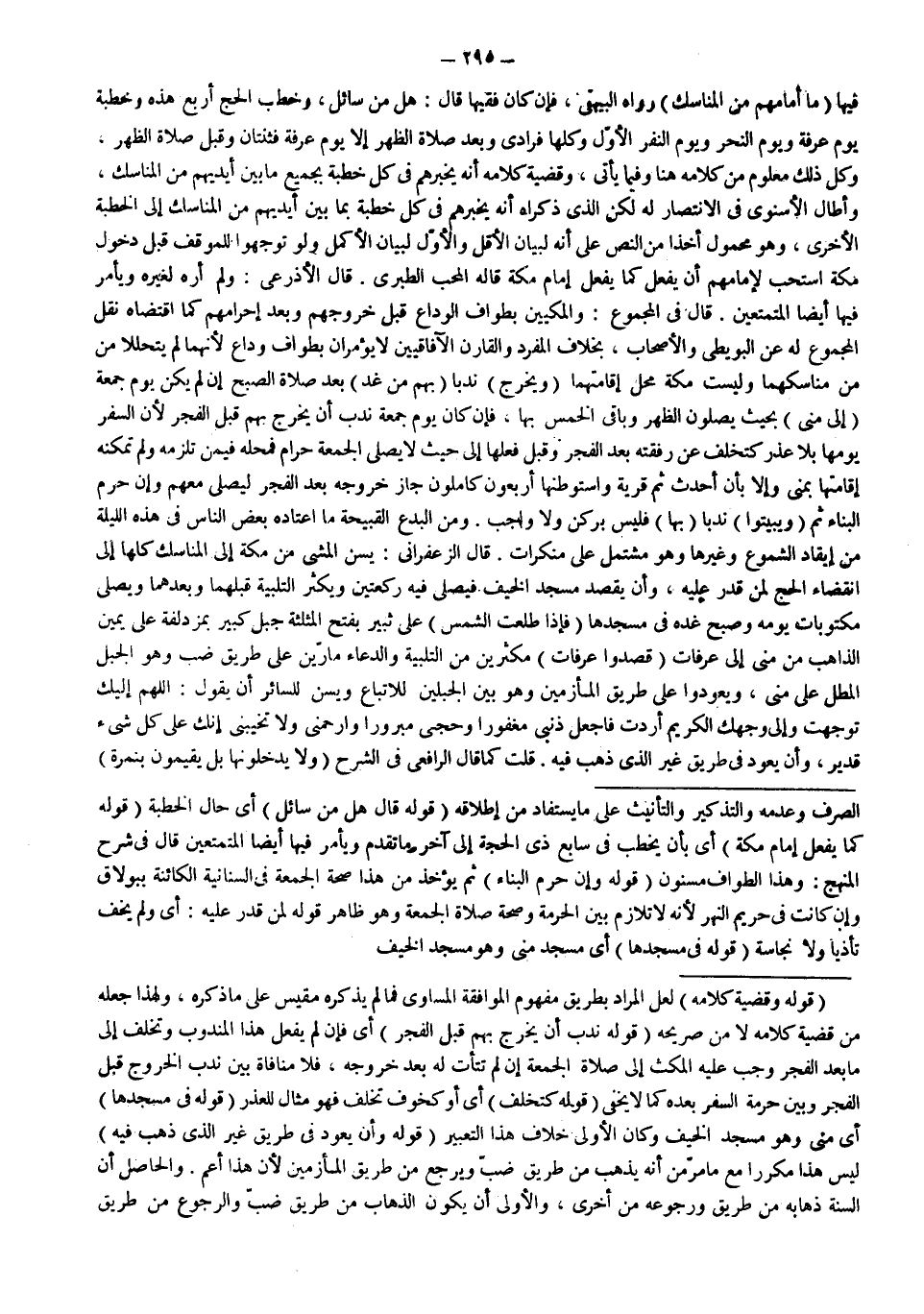 فِيهَا (مَا أَمَامَهُمْ مِنْ الْمَنَاسِكِ) رَوَاهُ الْبَيْهَقِيُّ، فَإِنْ كَانَ فَقِيهًا قَالَ: هَلْ مِنْ سَائِلٍ، وَخُطَبُ الْحَجِّ أَرْبَعٌ هَذِهِ وَخُطْبَةُ يَوْمِ عَرَفَةَ وَيَوْمِ النَّحْرِ وَيَوْمِ النَّفْرِ الْأَوَّلِ وَكُلُّهَا فُرَادَى وَبَعْدَ صَلَاةِ الظُّهْرِ إلَّا يَوْمَ عَرَفَةَ فَثِنْتَانِ وَقَبْلَ صَلَاةِ الظُّهْرِ، وَكُلُّ ذَلِكَ مَعْلُومٌ مِنْ كَلَامِهِ هُنَا وَفِيمَا يَأْتِي، وَقَضِيَّةُ كَلَامِهِ أَنَّهُ يُخْبِرُهُمْ فِي كُلِّ خُطْبَةٍ بِجَمِيعِ مَا بَيْنَ أَيْدِيهِمْ مِنْ الْمَنَاسِكِ، وَأَطَالَ الْإِسْنَوِيُّ فِي الِانْتِصَارِ لَهُ لَكِنَّ الَّذِي ذَكَرَاهُ أَنَّهُ يُخْبِرُهُمْ فِي كُلِّ خُطْبَةٍ بِمَا بَيْنَ أَيْدِيهِمْ مِنْ الْمَنَاسِكِ إلَى الْخُطْبَةِ الْأُخْرَى، وَهُوَ مَحْمُولٌ أَخْذًا مِنْ النَّصِّ عَلَى أَنَّهُ لِبَيَانِ الْأَقَلِّ، وَالْأَوَّلُ لِبَيَانِ الْأَكْمَلِ وَلَوْ تَوَجَّهُوا لِلْمَوْقِفِ قَبْلَ دُخُولِ مَكَّةَ اُسْتُحِبَّ لِإِمَامِهِمْ أَنْ يَفْعَلَ كَمَا يَفْعَلُ إمَامُ مَكَّةَ قَالَهُ الْمُحِبُّ الطَّبَرِيُّ.