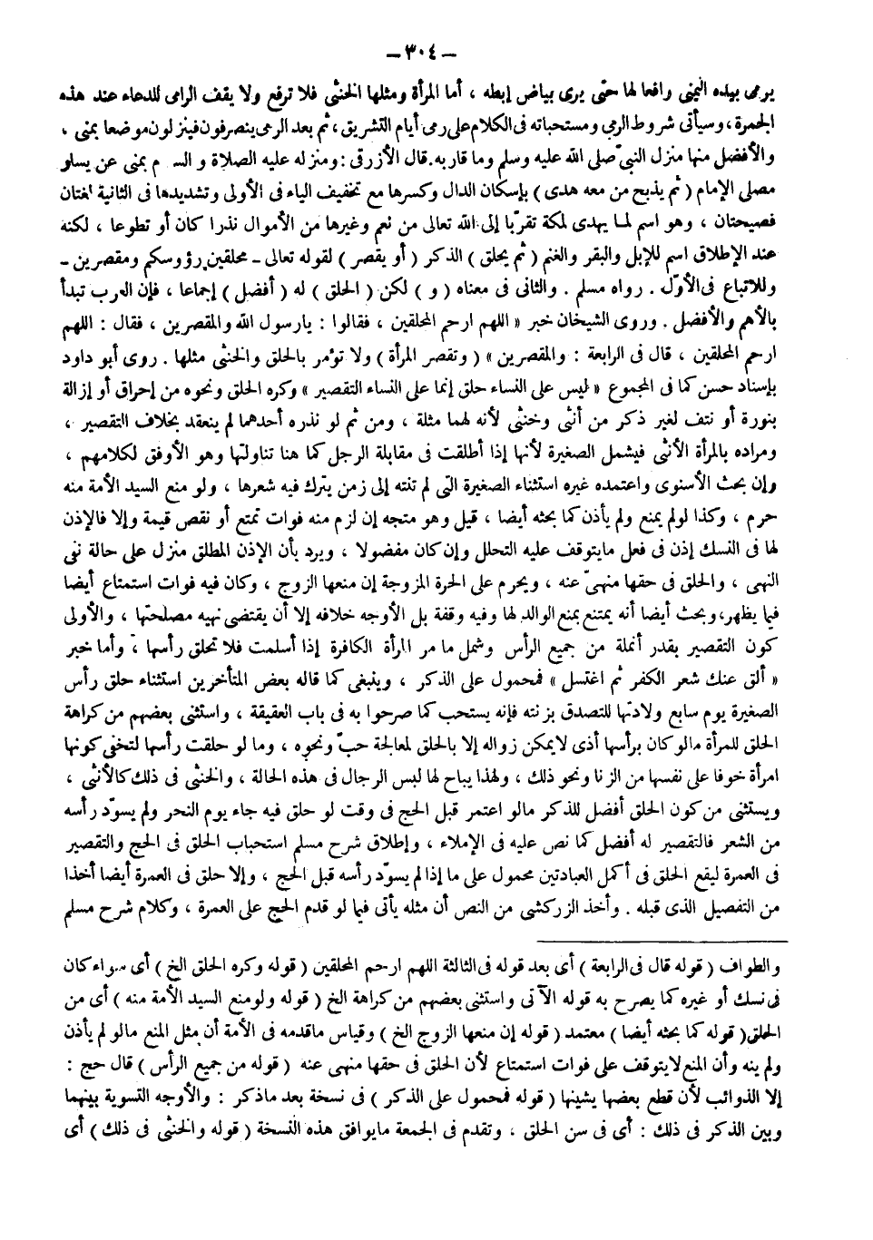 رَوَى أَبُو دَاوُد بِإِسْنَادٍ حَسَنٍ كَمَا فِي الْمَجْمُوعِ «لَيْسَ عَلَى النِّسَاءِ حَلْقٌ إنَّمَا عَلَى النِّسَاءِ التَّقْصِيرُ» وَكُرِهَ الْحَلْقُ وَنَحْوُهُ مِنْ إحْرَاقٍ أَوْ إزَالَةِ بِنُورَةٍ أَوْ نَتْفٍ لِغَيْرِ ذَكَرٍ مِنْ أُنْثَى وَخُنْثَى؛ لِأَنَّهُ لَهُمَا مُثْلَةٌ، وَمِنْ ثَمَّ لَوْ نَذَرَهُ أَحَدُهُمَا لَمْ يَنْعَقِدْ بِخِلَافِ التَّقْصِيرِ، وَمُرَادُهُ بِالْمَرْأَةِ الْأُنْثَى فَيَشْمَلُ الصَّغِيرَةَ؛ لِأَنَّهَا إذَا أُطْلِقَتْ فِي مُقَابَلَةِ الرَّجُلِ كَمَا هُنَا تَنَاوَلَتْهَا وَهُوَ الْأَوْفَقُ لِكَلَامِهِمْ، وَإِنْ بَحَثَ الْإِسْنَوِيُّ وَاعْتَمَدَهُ غَيْرُهُ اسْتِثْنَاءُ الصَّغِيرَةِ الَّتِي لَمْ تَنْتَهِ إلَى زَمَنٍ يُتْرَكُ فِيهِ شَعْرُهَا، وَلَوْ مَنَعَ السَّيِّدُ الْأَمَةَ مِنْهُ حَرُمَ، وَكَذَا لَوْ لَمْ يَمْنَعْ وَلَمْ يَأْذَنْ كَمَا بَحَثَهُ أَيْضًا، قِيلَ وَهُوَ مُتَّجَهٌ إنْ لَزِمَ مِنْهُ فَوَاتُ تَمَتُّعٍ أَوْ نَقْصِ قِيمَةٍ وَإِلَّا فَالْإِذْن لَهَا فِي النُّسُكِ إذْنٌ فِي فِعْلِ مَا يَتَوَقَّفُ عَلَيْهِ التَّحَلُّلُ وَإِنْ كَانَ مَفْضُولًا، وَيُرَدُّ بِأَنَّ الْإِذْنَ الْمُطْلَقَ مُنَزَّلٌ عَلَى حَالَةِ نَفْيِ النَّهْيِ، وَالْحَلْقُ فِي حَقِّهَا مَنْهِيٌّ عَنْهُ، وَيَحْرُمُ عَلَى الْحُرَّةِ الْمُزَوِّجَةِ إنْ مَنَعَهَا الزَّوْجُ، وَكَانَ فِيهِ فَوَاتُ اسْتِمْتَاعٍ أَيْضًا فِيمَا يَظْهَرُ، وَبَحَثَ أَيْضًا أَنَّهُ يَمْتَنِعُ بِمَنْعِ الْوَالِدِ لَهَا وَفِيهِ وَقْفَةٌ بَلْ الْأَوْجَهُ خِلَافُهُ إلَّا أَنْ يَقْتَضِيَ نَهْيُهُ مَصْلَحَتَهَا، وَالْأَوْلَى كَوْنُ التَّقْصِيرِ بِقَدْرِ أُنْمُلَةٍ مِنْ جَمِيعِ الرَّأْسِ وَشَمِلَ مَا مَرَّ الْمَرْأَةَ الْكَافِرَةَ إذَا أَسْلَمَتْ فَلَا تَحْلِقُ رَأْسَهَا، وَأَمَّا خَبَرُ «أَلْقِ عَنْك شَعْرَ الْكُفْرِ ثُمَّ اغْتَسِلْ» فَمَحْمُولٌ عَلَى الذَّكَرِ، وَيَنْبَغِي كَمَا قَالَهُ بَعْضُ الْمُتَأَخِّرِينَ اسْتِثْنَاءُ حَلْقِ رَأْسِ الصَّغِيرَةِ يَوْمَ سَابِعِ وِلَادَتِهَا لِلتَّصَدُّقِ بِزِنَتِهِ فَإِنَّهُ يُسْتَحَبُّ كَمَا صَرَّحُوا بِهِ فِي بَابِ الْعَقِيقَةِ، وَاسْتَثْنَى بَعْضُهُمْ مِنْ كَرَاهَةِ الْحَلْقِ لِلْمَرْأَةِ مَا لَوْ كَانَ بِرَأْسِهَا أَذًى لَا يُمْكِنُ زَوَالُهُ إلَّا بِالْحَلْقِ لِمُعَالَجَةِ حَبٍّ وَنَحْوِهِ، وَمَا لَوْ حَلَقَتْ رَأْسَهَا لِتُخْفِي كَوْنَهَا امْرَأَةً خَوْفًا عَلَى نَفْسِهَا مِنْ الزِّنَا وَنَحْوِ ذَلِكَ، وَلِهَذَا يُبَاحُ لَهَا لُبْسُ الرِّجَالِ فِي هَذِهِ الْحَالَةِ، وَالْخُنْثَى فِي ذَلِكَ كَالْأُنْثَى، وَيُسْتَثْنَى مِنْ كَوْنِ الْحَلْقِ أَفْضَلُ لِلذَّكَرِ مَا لَوْ اعْتَمَرَ قَبْلَ الْحَجِّ فِي وَقْتٍ لَوْ حَلَقَ فِيهِ جَاءَ يَوْمُ النَّحْرِ وَلَمْ يَسْوَدَّ رَأْسُهُ مِنْ الشَّعْرِ فَالتَّقْصِيرُ لَهُ أَفْضَلُ كَمَا نَصَّ عَلَيْهِ فِي الْإِمْلَاءِ، وَإِطْلَاقُ شَرْحِ مُسْلِمٍ اسْتِحْبَابَ الْحَلْقِ فِي الْحَجِّ وَالتَّقْصِيرِ فِي الْعُمْرَةِ لِيَقَعَ الْحَلْقُ فِي أَكْمَلِ الْعِبَادَتَيْنِ مَحْمُولٌ عَلَى مَا إذَا لَمْ يَسْوَدَّ رَأْسُهُ قَبْلَ الْحَجِّ، وَإِلَّا حَلَقَ فِي الْعُمْرَةِ أَيْضًا أَخْذًا مِنْ التَّفْصِيلِ الَّذِي قَبْلَهُ وَأَخَذَ الزَّرْكَشِيُّ مِنْ النَّصِّ أَنَّ مِثْلَهُ يَأْتِي فِيمَا لَوْ قَدَّمَ الْحَجَّ عَلَى الْعُمْرَةِ، وَكَلَامُ شَرْحِ مُسْلِمٍ
