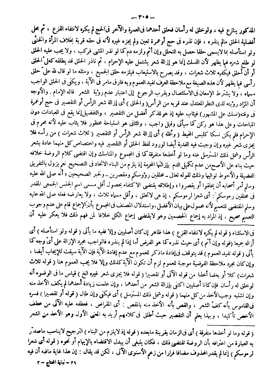 (قَوْلُهُ: لَمْ يُكْرَهْ لِانْتِفَاءِ الْقَزَعِ) هَذَا ظَاهِرٌ إنْ كَانَ أَصْلِيَّيْنِ وَإِلَّا فَفِيهِ مَا يَأْتِي (قَوْلُهُ: وَلَوْ اسْتَأْصَلَهُ) أَيْ أَزَالَهُ جَمِيعًا (قَوْلُهُ: وَإِنْ أَثِمَ) أَيْ حَيْثُ نَذَرَهُ كَمَا هُوَ الْفَرْضُ أَمَّا إذَا لَمْ يَنْذُرْهُ فَالْوَاجِبُ مُجَرَّدُ الْإِزَالَةِ عَلَى أَيِّ وَجْهٍ كَمَا يَأْتِي (قَوْلُهُ: تُفِيدُ الْعُمُومَ) قَدْ يَتَوَقَّفُ فِي إفَادَةِ مَا ذُكِرَ لِلْعُمُومِ مَعَ عَدَمِ إفَادَةِ الْآيَةِ فَإِنَّ الْآيَةَ سِيقَتْ لِلْإِيجَابِ أَيْضًا، وَإِنْ كَانَ مُجَرَّدُ مُلَاحَظَةِ الْفَرْضِيَّةِ مُوجِبَةٌ لِلْعُمُومِ لَزِمَ أَنْ تَكُونَ الْآيَةُ كَذَلِكَ وَإِلَّا فَلَا يَجِبُ الْعُمُومُ هُنَا (قَوْلُهُ: ثَلَاثُ شَعَرَاتٍ) كُلًّا أَوْ بَعْضًا أَخْذًا مِنْ قَوْلِهِ الْآتِي أَوْ تَقْصِيرًا (قَوْلُهُ: فَلَا يُجْزِئُ شَعْرُ غَيْرِهِ إلَخْ) قِيَاسُ مَا فِي الْوُضُوءِ أَنَّهُ لَوْ خُلِقَ لَهُ رَأْسَانِ فَإِنْ كَانَا أَصْلِيَّيْنِ اكْتَفَى بِإِزَالَةِ الشَّعْرِ مِنْ أَحَدِهِمَا، وَإِنْ عُلِمَتْ زِيَادَةُ أَحَدِهِمَا لَمْ يَكْفِ الْأَخْذُ مِنْهُ وَإِنْ اشْتَبَهَ وَجَبَ الْأَخْذُ مِنْ كُلٍّ مِنْهُمَا (قَوْلُهُ: وَشَمِلَ ذَلِكَ الْمُسْتَرْسِلَ) أَيْ فَيَكْفِي وَإِنْ طَالَ (قَوْلُهُ: أَوْ تَقْصِيرًا) فَسَّرَهُ فِي الْقَامُوسِ بِأَنَّهُ كَفُّ الشَّعْرِ، وَالْقَصُّ بِأَنَّهُ الْأَخْذُ مِنْهُ بِالْمِقَصِّ: أَيْ الْمِقْرَاضِ، فَعَطْفُهُ عَلَيْهِ الْآتِي مِنْ عَطْفِ الْأَخَصِّ تَأْكِيدًا، وَبِهَذَا يُعْلَمُ أَنَّ التَّقْصِيرَ حَيْثُ أُطْلِقَ فِي كَلَامِهِمْ أُرِيدَ بِهِ الْمَعْنَى الْأَوَّلُ وَهُوَ الْأَخْذُ مِنْ الشَّعْرِ