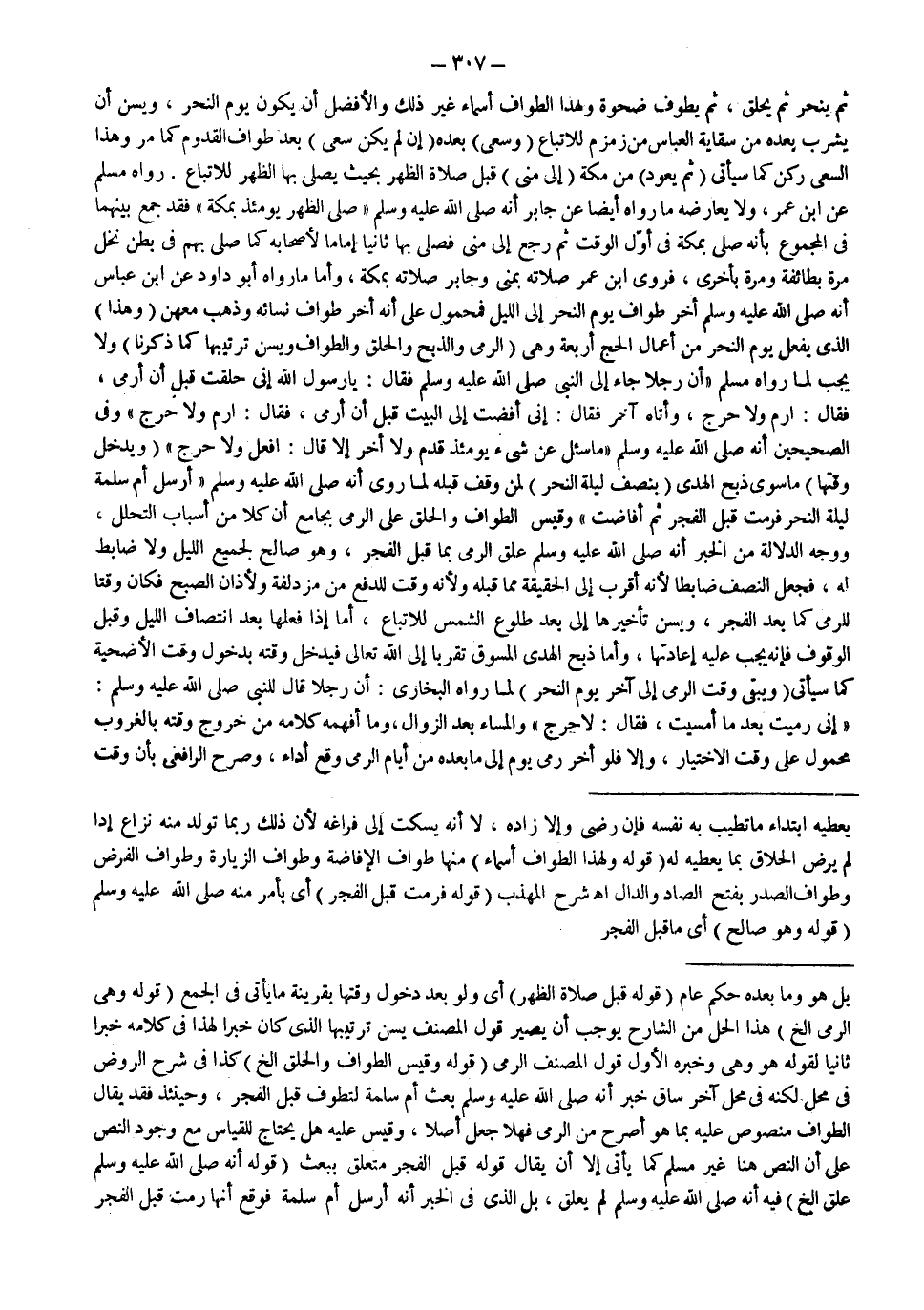 ثُمَّ يَنْحَرَ ثُمَّ يَحْلِقَ، ثُمَّ يَطُوفَ ضَحْوَةً وَلِهَذَا الطَّوَافِ أَسْمَاءٌ غَيْرُ ذَلِكَ وَالْأَفْضَلُ أَنْ يَكُونَ يَوْمَ النَّحْرِ، وَيُسَنُّ أَنْ يَشْرَبَ بَعْدَهُ مِنْ سِقَايَةِ الْعَبَّاسِ مِنْ زَمْزَمَ لِلِاتِّبَاعِ (وَسَعَى) بَعْدَهُ (إنْ لَمْ يَكُنْ سَعَى) بَعْدَ طَوَافِ الْقُدُومِ كَمَا مَرَّ وَهَذَا السَّعْيُ رُكْنٌ كَمَا سَيَأْتِي (ثُمَّ يَعُودُ) مِنْ مَكَّةَ (إلَى مِنًى) قَبْلَ صَلَاةِ الظُّهْرِ بِحَيْثُ يُصَلِّي بِهَا الظُّهْرَ لِلِاتِّبَاعِ رَوَاهُ مُسْلِمٌ عَنْ ابْنِ عُمَرَ، وَلَا يُعَارِضُهُ مَا رَوَاهُ أَيْضًا عَنْ جَابِرٍ أَنَّهُ - صَلَّى اللَّهُ عَلَيْهِ وَسَلَّمَ - «صَلَّى الظُّهْرَ يَوْمَئِذٍ بِمَكَّةَ» فَقَدْ جَمَعَ بَيْنَهُمَا فِي الْمَجْمُوعِ بِأَنَّهُ صَلَّى بِمَكَّةَ فِي أَوَّلِ الْوَقْتِ ثُمَّ رَجَعَ إلَى مِنًى فَصَلَّى بِهَا ثَانِيًا إمَامًا لِأَصْحَابِهِ كَمَا صَلَّى بِهِمْ فِي بَطْنِ نَخْلٍ مَرَّةً بِطَائِفَةٍ وَمَرَّةً بِأُخْرَى، فَرَوَى ابْنُ عُمَرَ صَلَاتَهُ بِمِنًى وَجَابِرٌ صَلَاتَهُ بِمَكَّةَ، وَأَمَّا مَا رَوَاهُ أَبُو دَاوُد عَنْ ابْنِ عَبَّاسٍ «أَنَّهُ - صَلَّى اللَّهُ عَلَيْهِ وَسَلَّمَ - أَخَّرَ طَوَافَ يَوْمِ النَّحْرِ إلَى اللَّيْلِ» فَمَحْمُولٌ عَلَى أَنَّهُ أَخَّرَ طَوَافَ نِسَائِهِ وَذَهَبَ مَعَهُنَّ (وَهَذَا) الَّذِي يُفْعَلُ يَوْمَ النَّحْرِ مِنْ أَعْمَالِ الْحَجِّ أَرْبَعَةٌ وَهِيَ (الرَّمْيُ وَالذَّبْحُ وَالْحَلْقُ وَالطَّوَافُ وَيُسَنُّ تَرْتِيبُهَا) (كَمَا ذَكَرْنَا) وَلَا يَجِبُ لِمَا رَوَاهُ مُسْلِمٌ «أَنَّ رَجُلًا جَاءَ إلَى النَّبِيِّ - صَلَّى اللَّهُ عَلَيْهِ وَسَلَّمَ - فَقَالَ: يَا رَسُولَ اللَّهِ إنِّي حَلَقْت قَبْلَ أَنْ أَرْمِيَ، فَقَالَ: ارْمِ وَلَا حَرَجَ، وَأَتَاهُ آخَرُ فَقَالَ: إنِّي أَفَضْت إلَى الْبَيْتِ قَبْلَ أَنْ أَرْمِيَ، فَقَالَ: ارْمِ وَلَا حَرَجَ» وَفِي الصَّحِيحَيْنِ أَنَّهُ - صَلَّى اللَّهُ عَلَيْهِ وَسَلَّمَ - «مَا سُئِلَ عَنْ شَيْءٍ يَوْمئِذٍ قُدِّمَ وَلَا أُخِّرَ إلَّا قَالَ: افْعَلْ وَلَا حَرَجَ» (وَيَدْخُلُ وَقْتُهَا) مَا سِوَى ذَبْحِ الْهَدْيِ (بِنِصْفِ لَيْلَةِ النَّحْرِ) لِمَنْ وَقَفَ قَبْلَهُ لِمَا رُوِيَ أَنَّهُ - صَلَّى اللَّهُ عَلَيْهِ وَسَلَّمَ - «أَرْسَلَ أُمَّ سَلَمَةَ لَيْلَةَ النَّحْرِ فَرَمَتْ قَبْلَ الْفَجْرِ ثُمَّ أَفَاضَتْ» وَقِيسَ الطَّوَافُ وَالْحَلْقُ عَلَى الرَّمْيِ بِجَامِعِ أَنَّ كُلًّا مِنْ أَسْبَابِ التَّحَلُّلِ، وَوَجْهُ الدَّلَالَةِ مِنْ الْخَبَرِ أَنَّهُ - صَلَّى اللَّهُ عَلَيْهِ وَسَلَّمَ - عَلَّقَ الرَّمْيَ بِمَا قَبْلَ الْفَجْرِ، وَهُوَ صَالِحٌ لِجَمِيعِ اللَّيْلِ وَلَا ضَابِطَ لَهُ، فَجَعَلَ النِّصْفَ ضَابِطًا؛ لِأَنَّهُ أَقْرَبُ إلَى الْحَقِيقَةِ مِمَّا قَبْلَهُ؛ وَلِأَنَّهُ وَقْتٌ لِلدَّفْعِ مِنْ مُزْدَلِفَةَ وَلِأَذَانِ الصُّبْحِ فَكَانَ وَقْتًا لِلرَّمْيِ كَمَا بَعْدَ الْفَجْرِ، وَيُسَنُّ تَأْخِيرُهَا إلَى بَعْدَ طُلُوعِ الشَّمْسِ لِلِاتِّبَاعِ، أَمَّا إذَا فَعَلَهَا بَعْدَ انْتِصَافِ اللَّيْلِ وَقَبْلَ الْوُقُوفِ فَإِنَّهُ يَجِبُ عَلَيْهِ إعَادَتُهَا، وَأَمَّا ذَبْحُ الْهَدْيِ الْمَسُوقِ تَقَرُّبًا إلَى اللَّهِ تَعَالَى فَيَدْخُلُ وَقْتُهُ بِدُخُولِ وَقْتِ الْأُضْحِيَّةِ كَمَا سَيَأْتِي.