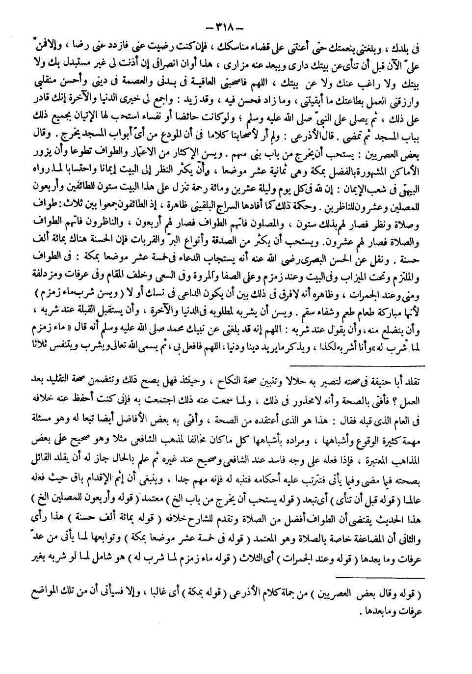 فِي بَلَدِك، وَبَلَّغْتنِي بِنِعْمَتِك حَتَّى أَعَنْتَنِي عَلَى قَضَاءِ مَنَاسِكِك، فَإِنْ كُنْت رَضِيت عَنِّي فَازْدَدْ عَنِّي رِضًا، وَإِلَّا فَمُنَّ عَلَيَّ الْآنَ قَبْلَ أَنْ تَنْأَى عَنْ بَيْتِك دَارِي وَيَبْعُدَ عَنْهُ مَزَارِي، هَذَا أَوَانُ انْصِرَافِي إنْ أَذِنْت لِي غَيْرَ مُسْتَبْدِلٍ بِك وَلَا بَيْتِك وَلَا رَاغِبٍ عَنْك وَلَا عَنْ بَيْتِك، اللَّهُمَّ فَأَصْحِبْنِي الْعَافِيَةَ فِي بَدَنِي وَالْعِصْمَةَ فِي دِينِي وَأَحْسِنْ مُنْقَلَبِي وَارْزُقْنِي الْعَمَلَ بِطَاعَتِك مَا أَبْقَيْتنِي، وَمَا زَادَ فَحَسِّنْ فِيهِ، وَقَدْ زِيدَ: وَاجْمَعْ لِي خَيْرَيْ الدُّنْيَا وَالْآخِرَةِ إنَّك قَادِرٌ عَلَى ذَلِكَ.
