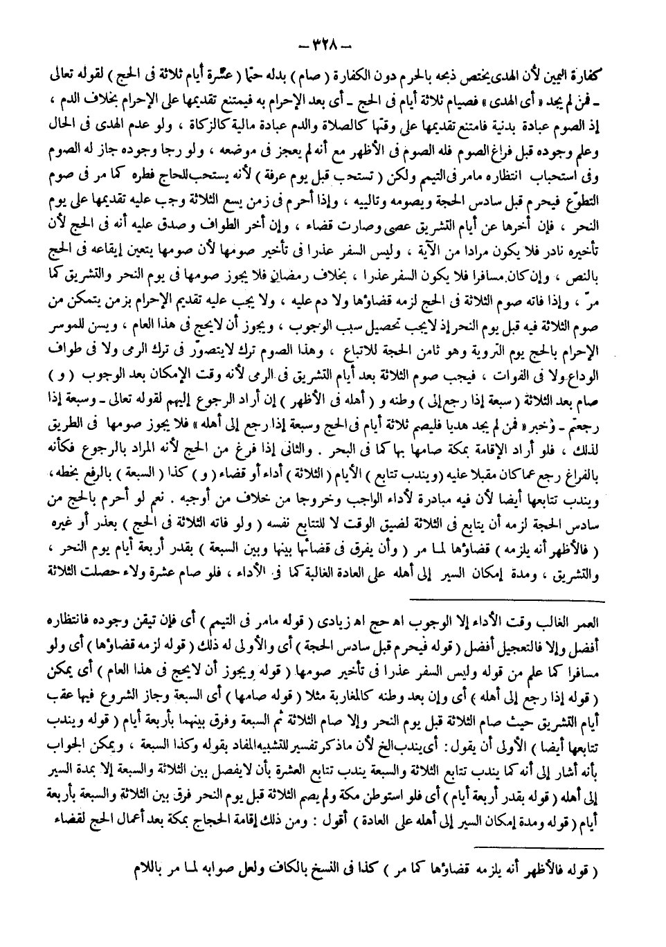 ـــــــــــــــــــــــــــــSالْعُمُرِ الْغَالِبِ وَقْتَ الْأَدَاءِ إلَّا الْوُجُوبُ اهـ حَجّ اهـ زِيَادِيٌّ (قَوْلُهُ: مَا مَرَّ فِي التَّيَمُّمِ) أَيْ فَإِنْ تَيَقَّنَ وُجُودَهُ فَانْتِظَارُهُ أَفْضَلُ وَإِلَّا فَالتَّعْجِيلُ أَفْضَلُ (قَوْلُهُ: فَيُحْرِمُ قَبْلَ سَادِسِ الْحِجَّةِ) أَيْ وَالْأَوْلَى لَهُ ذَلِكَ (قَوْلُهُ لَزِمَهُ قَضَاؤُهَا) أَيْ وَلَوْ مُسَافِرًا كَمَا عُلِمَ مِنْ قَوْلِهِ وَلَيْسَ السَّفَرُ عُذْرًا فِي تَأْخِيرِ صَوْمِهَا (قَوْلُهُ: وَيَجُوزُ أَنْ لَا يَحُجَّ فِي هَذَا الْعَامِ) أَيْ يُمْكِنُ (قَوْلُهُ: إذَا رَجَعَ إلَى أَهْلِهِ) أَيْ وَإِنْ بَعُدَ وَطَنُهُ كَالْمَغَارِبَةِ مَثَلًا (قَوْلُهُ: صَامَهَا) أَيْ السَّبْعَةَ وَجَازَ الشُّرُوعُ فِيهَا عَقِبَ أَيَّامِ التَّشْرِيقِ حَيْثُ صَامَ الثَّلَاثَةَ قَبْلَ يَوْمِ النَّحْرِ وَإِلَّا صَامَ الثَّلَاثَةَ ثُمَّ السَّبْعَةَ وَفَرَّقَ بَيْنَهُمَا بِأَرْبَعَةِ أَيَّامٍ (قَوْلُهُ: وَيُنْدَبُ تَتَابُعُهَا أَيْضًا) الْأَوْلَى أَنْ يَقُولَ: أَيْ يُنْدَبُ إلَخْ؛ لِأَنَّ مَا ذُكِرَ تَفْسِيرٌ لِلتَّشْبِيهِ الْمُفَادِ بِقَوْلِهِ وَكَذَا السَّبْعَةُ، وَيُمْكِنُ الْجَوَابُ بِأَنَّهُ أَشَارَ إلَى أَنَّهُ كَمَا يُنْدَبُ تَتَابُعُ الثَّلَاثَةِ وَالسَّبْعَةِ يُنْدَبُ تَتَابُعُ الْعَشَرَةِ بِأَنْ لَا يَفْصِلَ بَيْنَ الثَّلَاثَةِ وَالسَّبْعَةِ إلَّا بِمُدَّةِ السَّيْرِ إلَى أَهْلِهِ (قَوْلُهُ: بِقَدْرِ أَرْبَعَةِ أَيَّامٍ) أَيْ فَلَوْ اسْتَوْطَنَ مَكَّةَ وَلَمْ يَصُمْ الثَّلَاثَةَ قَبْلَ يَوْمِ النَّحْرِ فَرَقَ بَيْنَ الثَّلَاثَةِ وَالسَّبْعَةِ بِأَرْبَعَةِ أَيَّامٍ (قَوْلُهُ: وَمُدَّةُ إمْكَانِ السَّيْرِ إلَى أَهْلِهِ عَلَى الْعَادَةِ) أَقُولُ: وَمِنْ ذَلِكَ إقَامَةُ الْحُجَّاجِ بِمَكَّةَ بَعْدَ أَعْمَالِ الْحَجِّ لِقَضَاءِ