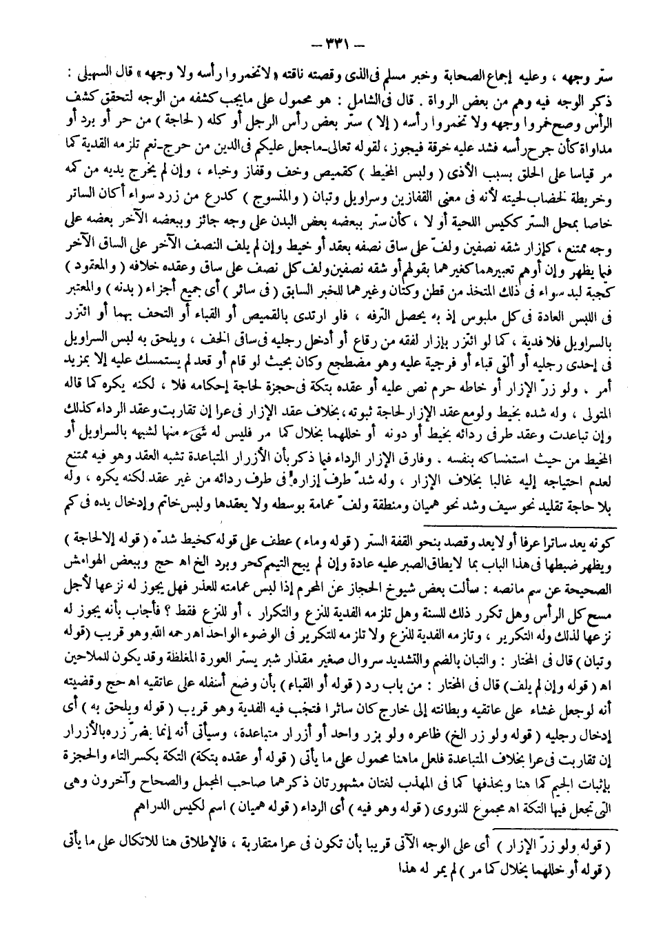 قَالَ فِي الشَّامِلِ: هُوَ مَحْمُولٌ عَلَى مَا يَجِبُ كَشْفُهُ مِنْ الْوَجْهِ لِتَحَقُّقِ كَشْفِ الرَّأْسِ وَصَحَّ خَمِّرُوا وَجْهَهُ وَلَا تُخَمِّرُوا رَأْسَهُ (إلَّا) سِتْرَ بَعْضِ رَأْسِ الرَّجُلِ أَوْ كُلِّهِ (لِحَاجَةٍ) مِنْ حَرٍّ أَوْ بَرْدٍ أَوْ مُدَاوَاةٍ كَأَنْ جُرِحَ رَأْسُهُ فَشَدَّ عَلَيْهِ خِرْقَةً فَيَجُوزُ، لِقَوْلِهِ تَعَالَى {وَمَا جَعَلَ عَلَيْكُمْ فِي الدِّينِ مِنْ حَرَجٍ} [الحج: 78] نَعَمْ تَلْزَمُهُ الْفِدْيَةُ كَمَا مَرَّ قِيَاسًا عَلَى الْحَلْقِ بِسَبَبِ الْأَذَى (وَلُبْسِ الْمَخِيطِ) كَقَمِيصٍ وَخُفٍّ وَقُفَّازٍ وَخِبَاءٍ، وَإِنْ لَمْ يُخْرِجْ يَدَيْهِ مِنْ كُمِّهِ وَخَرِيطَةٍ لِخِضَابِ لِحْيَتِهِ؛ لِأَنَّهُ فِي مَعْنَى الْقُفَّازَيْنِ وَسَرَاوِيلَ وَتُبَّانٍ (وَالْمَنْسُوجِ) كَدِرْعٍ مِنْ زَرَدٍ سَوَاءٌ أَكَانَ السَّاتِرُ خَاصًّا بِمَحَلِّ السَّتْرِ كَكِيسِ اللِّحْيَةِ أَوْ لَا، كَأَنْ سَتَرَ بِبَعْضِهِ بَعْضَ الْبَدَنِ عَلَى وَجْهٍ جَائِزٍ وَبِبَعْضِهِ الْآخَرِ بَعْضَهُ عَلَى وَجْهٍ مُمْتَنِعٍ، كَإِزَارٍ شَقَّهُ نِصْفَيْنِ وَلَفَّ عَلَى سَاقٍ نِصْفَهُ بِعَقْدٍ أَوْ خَيْطٍ وَإِنْ لَمْ يَلُفَّ النِّصْفَ الْآخَرَ عَلَى السَّاقِ الْآخَرِ فِيمَا يَظْهَرُ وَإِنْ أَوْهَمَ تَعْبِيرُهُمَا كَغَيْرِهِمَا بِقَوْلِهِمْ أَوْ شَقَّهُ نِصْفَيْنِ وَلَفَّ كُلَّ نِصْفٍ عَلَى سَاقٍ وَعَقَدَهُ خِلَافَهُ (وَالْمَعْقُودُ) كَجُبَّةِ لَبَدٍ سَوَاءً فِي ذَلِكَ الْمُتَّخَذُ مِنْ قُطْنٍ وَكَتَّانٍ وَغَيْرِهِمَا لِلْخَبَرِ السَّابِقِ (فِي سَائِرِ) أَيْ جَمِيعِ أَجْزَاءِ (بَدَنِهِ) وَالْمُعْتَبَرُ فِي اللُّبْسِ الْعَادَةُ فِي كُلِّ مَلْبُوسٍ إذْ بِهِ يَحْصُلُ التَّرَفُّهُ، فَلَوْ ارْتَدَى بِالْقَمِيصِ أَوْ الْقَبَاءِ أَوْ الْتَحَفَ بِهِمَا أَوْ ائْتَزَرَ بِالسَّرَاوِيلِ فَلَا فِدْيَةَ، كَمَا لَوْ ائْتَزَرَ بِإِزَارٍ لَفَّقَهُ مِنْ رِقَاعٍ أَوْ أَدْخَلَ رِجْلَيْهِ فِي سَاقَيْ الْخُفِّ، وَيَلْحَقُ بِهِ لُبْسُ السَّرَاوِيلِ فِي إحْدَى رِجْلَيْهِ أَوْ أَلْقَى قَبَاءً أَوْ فَرَجِيَّة عَلَيْهِ وَهُوَ مُضْطَجِعٌ وَكَانَ بِحَيْثُ لَوْ قَامَ أَوْ قَعَدَ لَمْ يَسْتَمْسِكْ عَلَيْهِ إلَّا بِمَزِيدِ أَمْرٍ، وَلَوْ زَرَّ الْإِزَارَ أَوْ خَاطَهُ حَرُمَ نَصَّ عَلَيْهِ أَوْ عَقَدَهُ بِتِكَّةٍ فِي حُجْزَةِ لِحَاجَةِ إحْكَامِهِ فَلَا، لَكِنَّهُ يُكْرَهُ كَمَا قَالَهُ الْمُتَوَلِّي، وَلَهُ شَدُّهُ بِخَيْطٍ وَلَوْ مَعَ عَقْدِ الْإِزَارِ لِحَاجَةِ ثُبُوتِهِ، بِخِلَافِ عَقْدِ الْإِزَارِ فِي عُرًى إنْ تَقَارَبَتْ وَعَقْدُ الرِّدَاءِ كَذَلِكَ وَإِنْ تَبَاعَدَتْ وَعَقْدُ طَرَفَيْ رِدَائِهِ بِخَيْطٍ أَوْ دُونَهُ أَوْ خَلَّلَهُمَا بِخِلَالٍ كَمَا مَرَّ فَلَيْسَ لَهُ شَيْءٌ مِنْهَا لِشِبْهِهِ بِالسَّرَاوِيلِ أَوْ الْمَخِيطِ مِنْ حَيْثُ اسْتِمْسَاكِهِ بِنَفْسِهِ، وَفَارَقَ الْإِزَارُ الرِّدَاءَ فِيمَا ذَكَرَ بِأَنَّ الْأَزْرَارَ الْمُتَبَاعِدَةَ تُشْبِهُ الْعَقْدَ وَهُوَ فِيهِ مُمْتَنِعٌ لِعَدَمِ احْتِيَاجِهِ إلَيْهِ غَالِبًا بِخِلَافِ الْإِزَارِ، وَلَهُ شَدُّ طَرَفِ إزَارِهِ فِي طَرَفِ رِدَائِهِ مِنْ غَيْرِ عَقْدٍ لَكِنَّهُ يُكْرَهُ، وَلَهُ بِلَا حَاجَةِ تَقْلِيدٍ نَحْوُ سَيْفٍ وَشَدُّ نَحْوُ هِمْيَانٍ وَمِنْطَقَةٍ وَلَفُّ عِمَامَةٍ بِوَسَطِهِ وَلَا يَعْقِدُهَا وَلُبْسُ خَاتَمٍ وَإِدْخَالُ يَدِهِ فِي كُمٍّ