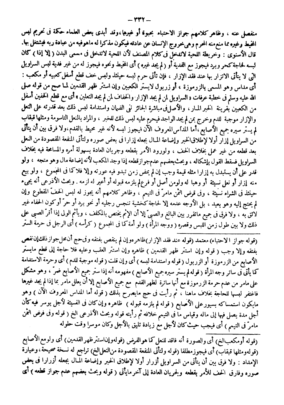 ـــــــــــــــــــــــــــــSقَوْلُهُ: جَوَازَ الِاحْتِبَاءِ) مُعْتَمَدٌ (قَوْلُهُ: عِنْدَ فَقْدِ الْإِزَارِ) ظَاهِرُهُ وَإِنْ لَمْ يَنْقُصْ بِفَتْقِهِ وَفِي حَجّ أَنَّ مَحَلَّ جَوَازِ ذَلِكَ إنْ نَقَصَ بِفَتْقِهِ وَإِلَّا وَجَبَ (قَوْلُهُ: وَإِنْ اسْتَتَرَ ظَهْرُ الْقَدَمَيْنِ) ظَاهِرُهُ وَإِنْ اسْتَتَرَ الْعَقِبُ وَعَلَيْهِ فَلَا حَاجَةَ إلَى قَطْعِ مَا يَسْتُرُ الْأَصَابِعَ مِنْ الزُّرْمُوزَةِ أَوْ الزُّرْبُورِ (قَوْلُهُ: وَاسْتِدَامَةُ لُبْسِهِ) أَيْ وَإِنْ قَلَّتْ (قَوْلُهُ: مُوجِبَةٌ لِلدَّمِ) أَيْ وَحُرْمَةُ الِاسْتِدَامَةِ كَمَا يَأْتِي فِي سَاتِرِ وَجْهِ الْمَرْأَةِ (قَوْلُهُ: لَمْ يَسْتُرْ سَيْرُهُ جَمِيعَ الْأَصَابِعِ) مَفْهُومُهُ أَنَّهُ إذَا سَتَرَ جَمِيعَ الْأَصَابِعِ ضَرَّ، وَهُوَ مُشْكِلٌ عَلَى مَا مَرَّ مِنْ عَدَمِ حُرْمَةِ الزُّرْمُوزَةِ مَعَ أَنَّهَا سَاتِرَةٌ لِظَهْرِ الْقَدَمِ مَعَ جَمِيعِ الْأَصَابِعِ إلَّا أَنْ يُعَلَّلَ مَا مَرَّ بِمَا إذَا لَمْ يَجِدْ غَيْرَهَا فَاغْتُفِرَ لُبْسُهَا لِلْحَاجَةِ بِخِلَافِ مَا هُنَا، ثُمَّ رَأَيْت فِي حَجّ مَا يُصَرِّحُ بِذَلِكَ (قَوْلُهُ: أَمَّا الْمَدَاسُ الْمَعْرُوفُ الْآنَ) وَهُوَ مَا يَكُونُ اسْتِمْسَاكُهُ بِسُيُورٍ عَلَى الْأَصَابِعِ (قَوْلُهُ لَمْ يَلْزَمْهُ قَبُولُهُ) ظَاهِرُهُ وَإِنْ كَانَ فِي النَّسِيئَةِ لِأَجَلٍ يُوسِرُ فِيهِ كَأَنْ أُجِّلَ مُدَّةً يَصِلُ فِيهَا إلَى مَالِهِ وَقِيَاسُ مَا فِي التَّيَمُّمِ خِلَافُهُ ثُمَّ رَأَيْتُ قَوْلَهُ وَبَحَثَ الْأَذْرَعِيُّ إلَخْ (قَوْلُهُ: وَفِي فَرْضِ الثَّمَنِ مَا مَرَّ فِي التَّيَمُّمِ) أَيْ فَيَجِبُ حَيْثُ كَانَ لِأَجَلٍ مَعَ زِيَادَةٍ تَلِيقُ بِالْأَجَلِ وَكَانَ مُوسِرًا وَقْتَ حُلُولِهَا