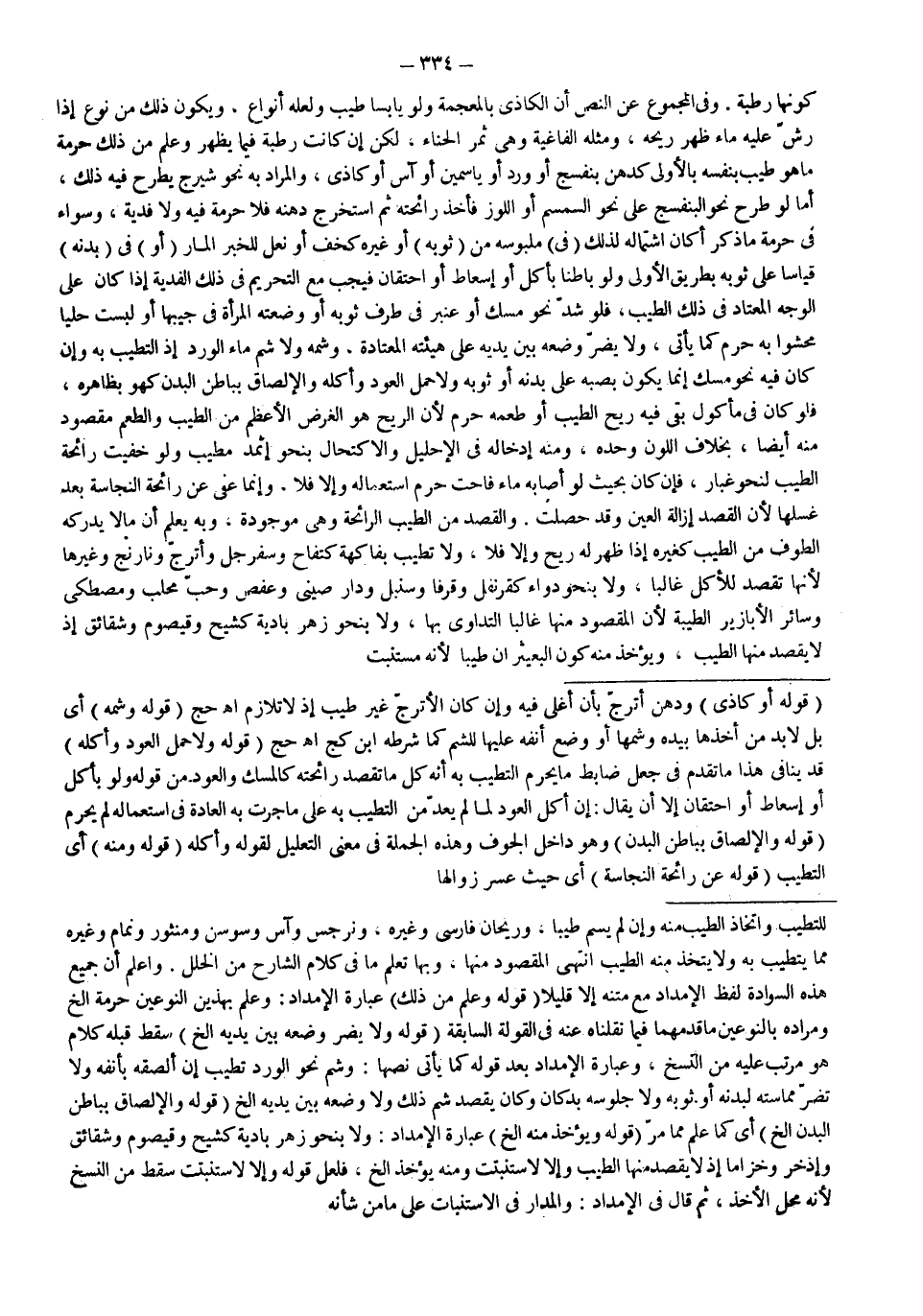كَوْنُهَا رَطْبَةً وَفِي الْمَجْمُوعِ عَنْ النَّصِّ أَنَّ الْكَاذِيَ بِالْمُعْجَمَةِ وَلَوْ يَابِسًا طِيبٌ وَلَعَلَّهُ أَنْوَاعٌ، وَيَكُونُ ذَلِكَ مِنْ نَوْعٍ إذَا رُشَّ عَلَيْهِ مَاءٌ ظَهَرَ رِيحُهُ، وَمِثْلُهُ الْفَاغِيَةُ وَهِيَ ثَمَرُ الْحِنَّاءِ، لَكِنْ إنْ كَانَتْ رَطْبَةً فِيمَا يَظْهَرُ وَعُلِمَ مِنْ ذَلِكَ حُرْمَةُ مَا هُوَ طِيبٌ بِنَفْسِهِ بِالْأَوْلَى كَدُهْنِ بَنَفْسَجٍ أَوْ وَرْدٍ أَوْ يَاسَمِينٍ أَوْ آسٍ أَوْ كَاذِيٍّ، وَالْمُرَادُ بِهِ نَحْوُ شَيْرَجٍ يُطْرَحُ فِيهِ ذَلِكَ، أَمَّا لَوْ طُرِحَ نَحْوُ الْبَنَفْسَجِ عَلَى نَحْوِ السِّمْسِمِ أَوْ اللَّوْزِ فَأَخَذَ رَائِحَتَهُ ثُمَّ اُسْتُخْرِجَ دُهْنُهُ فَلَا حُرْمَةَ فِيهِ وَلَا فِدْيَةَ، وَسَوَاءٌ فِي حُرْمَةِ مَا ذُكِرَ أَكَانَ اشْتِمَالُهُ لِذَلِكَ (فِي) مَلْبُوسِهِ مِنْ (ثَوْبِهِ) أَوْ غَيْرِهِ كَخُفٍّ أَوْ نَعْلٍ لِلْخَبَرِ الْمَارِّ (أَوْ) فِي (بَدَنِهِ) قِيَاسًا عَلَى ثَوْبِهِ بِطَرِيقِ الْأَوْلَى وَلَوْ بَاطِنًا بِأَكْلٍ أَوْ إسْعَاطٍ أَوْ احْتِقَانٍ فَيَجِبُ مَعَ التَّحْرِيمِ فِي ذَلِكَ الْفِدْيَةُ إذَا كَانَ عَلَى الْوَجْهِ الْمُعْتَادِ فِي ذَلِكَ الطِّيبِ، فَلَوْ شَدَّ نَحْوَ مِسْكٍ أَوْ عَنْبَرٍ فِي طَرَفِ ثَوْبِهِ أَوْ وَضَعَتْهُ الْمَرْأَةُ فِي جَيْبِهَا أَوْ لَبِسَتْ حُلِيًّا مَحْشُوًّا بِهِ حَرُمَ كَمَا يَأْتِي، وَلَا يَضُرُّ وَضْعُهُ بَيْنَ يَدَيْهِ عَلَى هَيْئَتِهِ الْمُعْتَادَةِ، وَشَمُّهُ وَلَا شَمُّ مَاءِ الْوَرْدِ إذْ التَّطَيُّبُ بِهِ وَإِنْ كَانَ فِيهِ نَحْوُ مِسْكٍ إنَّمَا يَكُونُ بِصَبِّهِ عَلَى بَدَنِهِ أَوْ ثَوْبِهِ وَلَا حَمْلُ الْعُودِ وَأَكْلُهُ وَالْإِلْصَاقُ بِبَاطِنِ الْبَدَنِ كَهُوَ بِظَاهِرِهِ، فَلَوْ كَانَ فِي مَأْكُولٍ بَقِيَ فِيهِ رِيحُ الطِّيبِ أَوْ طَعْمُهُ حَرُمَ؛ لِأَنَّ الرِّيحَ هُوَ الْغَرَضُ الْأَعْظَمُ مِنْ الطِّيبِ وَالطَّعْمُ مَقْصُودٌ مِنْهُ أَيْضًا، بِخِلَافِ اللَّوْنِ وَحْدَهُ، وَمِنْهُ إدْخَالُهُ فِي الْإِحْلِيلِ وَالِاكْتِحَالِ بِنَحْوِ إثْمِدٍ مُطَيَّبٍ وَلَوْ خَفِيَتْ رَائِحَةُ الطِّيبِ لِنَحْوِ غُبَارٍ، فَإِنْ كَانَ بِحَيْثُ لَوْ أَصَابَهُ مَاءٌ فَاحَتْ حَرُمَ اسْتِعْمَالُهُ وَإِلَّا فَلَا، وَإِنَّمَا عُفِيَ عَنْ رَائِحَةِ النَّجَاسَةِ بَعْدَ غَسْلِهَا؛ لِأَنَّ الْقَصْدَ إزَالَةُ الْعَيْنِ وَقَدْ حَصَلَتْ.