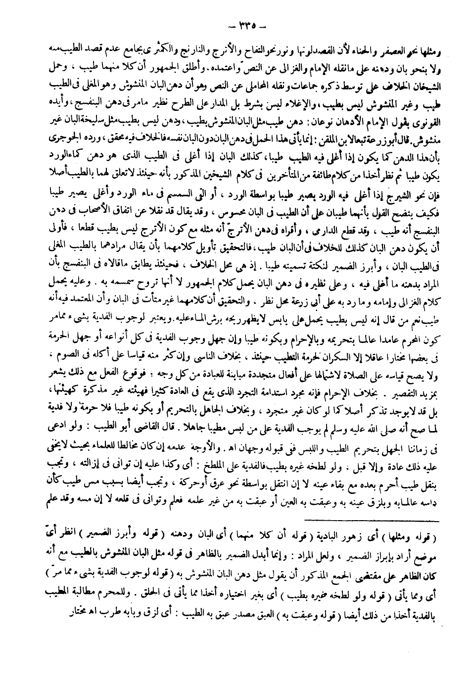 وَمِثْلُهَا نَحْوُ الْعُصْفُرِ وَالْحِنَّاءِ؛ لِأَنَّ الْقَصْدَ لَوْنُهَا وَنَوْرُ نَحْوِ التُّفَّاحِ وَالْأُتْرُجِّ وَالنَّارِنْجِ وَالْكُمَّثْرَى بِجَامِعِ عَدَمِ قَصْدِ الطِّيبِ مِنْهُ وَلَا بِنَحْوِ بَانٍ وَدُهْنِهِ عَلَى مَا نَقَلَهُ الْإِمَامُ وَالْغَزَالِيُّ عَنْ النَّصِّ وَاعْتَمَدَهُ، وَأَطْلَقَ الْجُمْهُورُ أَنَّ كُلًّا مِنْهُمَا طِيبٌ، وَحَمَلَ الشَّيْخَانِ الْخِلَافَ عَلَى تَوَسُّطٍ ذَكَرَهُ جَمَاعَاتٌ، وَنَقَلَهُ الْمَحَامِلِيُّ عَنْ النَّصِّ وَهُوَ أَنَّ دُهْنَ الْبَانِ الْمَنْشُوشِ وَهُوَ الْمَغْلِيِّ فِي الطِّيبِ طِيبٌ وَغَيْرَ الْمَنْشُوشِ لَيْسَ بِطِيبٍ، وَالْإِغْلَاءُ لَيْسَ بِشَرْطٍ بَلْ الْمَدَارُ عَلَى الطَّرْحِ نَظِيرُ مَا مَرَّ فِي دُهْنِ الْبَنَفْسَجِ، وَأَيَّدَهُ الْقُونَوِيُّ بِقَوْلِ الْإِمَامِ الْأَدْهَانُ نَوْعَانِ: دُهْنُ طِيبٍ مِثْلُ الْبَانِ الْمَنْشُوشِ بِطِيبٍ، وَدُهْنٌ لَيْسَ بِطِيبٍ مِثْلُ سَلِيخَةِ الْبَانِ غَيْرُ مَنْشُوشٍ.