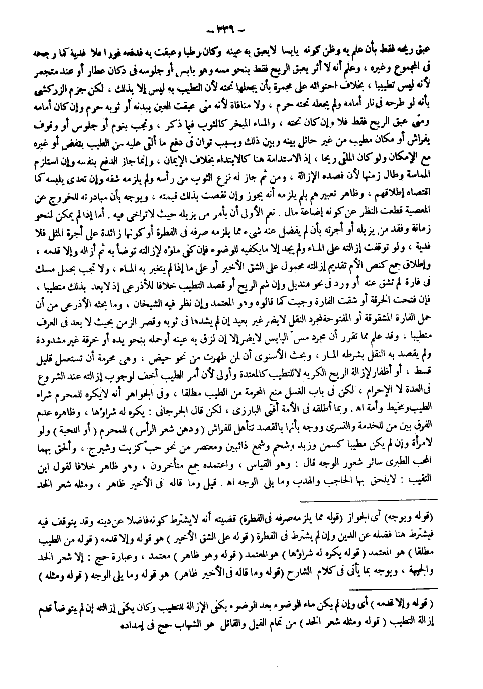 عَبَقَ رِيحِهِ فَقَطْ بِأَنْ عَلِمَ بِهِ وَظَنَّ كَوْنَهُ يَابِسًا لَا يَعْبَقُ بِهِ عَيْنُهُ وَكَانَ رَطْبًا وَعَبِقَتْ بِهِ فَدَفَعَهُ فَوْرًا فَلَا فِدْيَةَ كَمَا رَجَّحَهُ فِي الْمَجْمُوعِ وَغَيْرِهِ، وَعَلِمَ أَنَّهُ لَا أَثَرَ بِعَبَقِ الرِّيحِ فَقَطْ بِنَحْوِ مَسِّهِ وَهُوَ يَابِسٌ أَوْ جُلُوسِهِ فِي دُكَّانِ عَطَّارٍ أَوْ عِنْدَ مُتَجَمِّرٍ؛ لِأَنَّهُ لَيْسَ تَطْيِيبًا، بِخِلَافِ احْتِوَائِهِ عَلَى مِجْمَرَةٍ بِأَنْ يَجْعَلَهَا تَحْتَهُ؛ لِأَنَّ التَّطَيُّبَ بِهِ لَيْسَ إلَّا بِذَلِكَ، لَكِنْ جَزَمَ الزَّرْكَشِيُّ بِأَنَّهُ لَوْ طَرَحَهُ فِي نَارٍ أَمَامَهُ وَلَمْ يَجْعَلْهُ تَحْتَهُ حَرُمَ، وَلَا مُنَافَاةَ؛ لِأَنَّهُ مَتَى عَبِقَتْ الْعَيْنُ بِبَدَنِهِ أَوْ ثَوْبِهِ حَرُمَ وَإِنْ كَانَ أَمَامَهُ وَمَتَى عَبِقَ الرِّيحُ فَقَطْ فَلَا وَإِنْ كَانَ تَحْتَهُ، وَالْمَاءُ الْمُبَخَّرُ كَالثَّوْبِ فِيمَا ذَكَرَ، وَتَجِبُ بِنَوْمٍ أَوْ جُلُوسٍ أَوْ وُقُوفٍ بِفِرَاشٍ أَوْ مَكَان مُطَيَّبٍ مِنْ غَيْرِ حَائِلٍ بَيْنَهُ وَبَيْنَ ذَلِكَ وَبِسَبَبِ تَوَانٍ فِي دَفْعِ مَا أُلْقِيَ عَلَيْهِ مِنْ الطِّيبِ بِنَفْضٍ أَوْ غَيْرِهِ مَعَ الْإِمْكَانِ وَلَوْ كَانَ الْمُلْقَى رِيحًا، إذْ الِاسْتِدَامَةُ هُنَا كَالِابْتِدَاءِ بِخِلَافِ الْإِيمَانِ، وَإِنَّمَا جَازَ الدَّفْعُ بِنَفْسِهِ وَإِنْ اسْتَلْزَمَ الْمُمَاسَّةَ وَطَالَ زَمَنُهَا؛ لِأَنَّ قَصْدَهُ الْإِزَالَةُ.