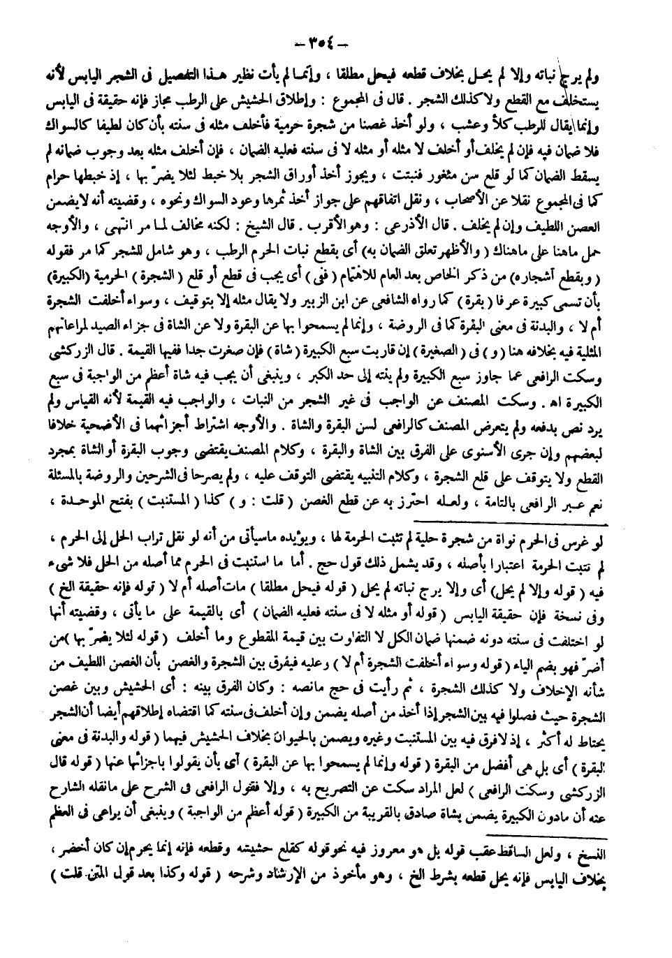 قَالَ الشَّيْخُ: لَكِنَّهُ مُخَالِفٌ لِمَا مَرَّ انْتَهَى، وَالْأَوْجَهُ حَمْلُ مَا هُنَا عَلَى مَا هُنَاكَ (وَالْأَظْهَرُ تَعَلُّقُ الضَّمَانِ بِهِ) أَيْ بِقَطْعِ نَبَاتِ الْحَرَمِ الرَّطْبِ، وَهُوَ شَامِلٌ لِلشَّجَرِ كَمَا مَرَّ فَقَوْلُهُ (وَبِقَطْعِ أَشْجَارِهِ) مِنْ ذِكْرِ الْخَاصِّ بَعْدَ الْعَامِّ لِلِاهْتِمَامِ (فَفِي) أَيْ يَجِبُ فِي قَطْعِ أَوْ قَلْعِ (الشَّجَرَةِ) الْحَرَمِيَّةِ (الْكَبِيرَةِ) بِأَنْ تُسَمَّى كَبِيرَةً عُرْفًا (بَقَرَةٌ) كَمَا رَوَاهُ الشَّافِعِيُّ عَنْ ابْنِ الزُّبَيْرِ وَلَا يُقَالُ مِثْلُهُ إلَّا بِتَوْقِيفٍ، وَسَوَاءٌ أَخْلَفَتْ الشَّجَرَةُ أَمْ لَا، وَالْبَدَنَةُ فِي مَعْنَى الْبَقَرَةِ كَمَا فِي الرَّوْضَةِ، وَإِنَّمَا لَمْ يَسْمَحُوا بِهَا عَنْ الْبَقَرَةِ وَلَا عَنْ الشَّاةِ فِي جَزَاءِ الصَّيْدِ لِمُرَاعَاتِهِمْ الْمِثْلِيَّةَ فِيهِ بِخِلَافِهِ هُنَا (وَ) فِي (الصَّغِيرَةِ) إنْ قَارَبَتْ سُبُعَ الْكَبِيرَةِ (شَاةٌ) فَإِنْ صَغُرَتْ جِدًّا فَفِيهَا الْقِيمَةُ.