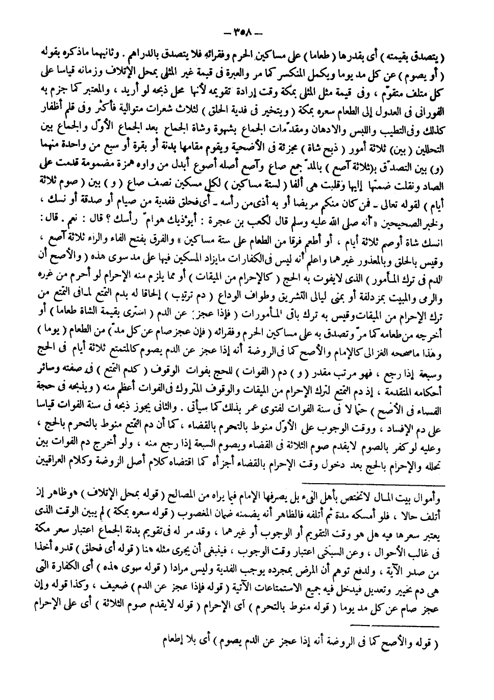 (قَوْلُهُ: أَيْ فَحَلَقَ) قَدْرَهُ أَخْذًا مِنْ صَدْرِ الْآيَةِ، وَلِدَفْعِ تَوَهُّمِ أَنَّ الْمَرَضَ بِمُجَرَّدِهِ يُوجِبُ الْفِدْيَةَ وَلَيْسَ مُرَادًا (قَوْلُهُ: سِوَى هَذِهِ) أَيْ الْكَفَّارَةِ الَّتِي هِيَ دَمُ تَخْيِيرٍ وَتَعْدِيلٍ فَيَدْخُلَ فِيهِ جَمِيعُ الِاسْتِمْتَاعَاتِ الْآتِيَةِ (قَوْلُهُ: فَإِذَا عَجَزَ عَنْ الدَّمِ) ضَعِيفٌ، وَكَذَا قَوْلُهُ وَإِنْ عَجَزَ صَامَ عَنْ كُلِّ مُدٍّ يَوْمًا.