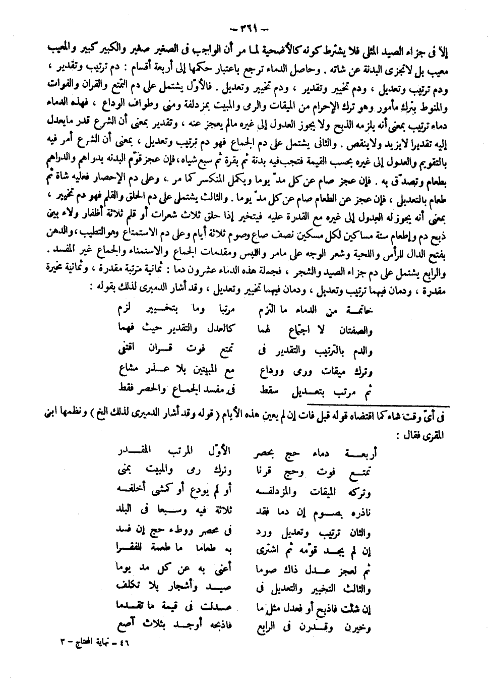 وَالرَّابِعُ يَشْتَمِلُ عَلَى دَمِ جَزَاءِ الصَّيْدِ وَالشَّجَرِ، فَجُمْلَةُ هَذِهِ الدِّمَاءِ عِشْرُونَ دَمًا: ثَمَانِيَةٌ مُتَرَتِّبَةٌ مُقَدَّرَةٌ، وَثَمَانِيَةٌ مُخَيَّرَةٌ مُقَدَّرَةٌ، وَدَمَانِ فِيهِمَا تَرْتِيبٌ وَتَعْدِيلٌ، وَدَمَانِ فِيهِمَا تَخْيِيرٌ وَتَعْدِيلٌ، وَقَدْ أَشَارَ الدَّمِيرِيِّ لِذَلِكَ بِقَوْلِهِ:
