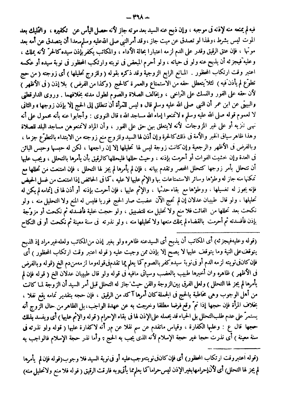وَرَوَى الدَّارَقُطْنِيّ وَالْبَيْهَقِيُّ عَنْ ابْنِ عُمَرَ «أَنَّ النَّبِيَّ - صَلَّى اللَّهُ عَلَيْهِ وَسَلَّمَ - قَالَ لَيْسَ لِلْمَرْأَةِ أَنْ تَنْطَلِقَ إلَى الْحَجِّ إلَّا بِإِذْنِ زَوْجِهَا» وَالثَّانِي لَا لِعُمُومِ قَوْلِهِ - صَلَّى اللَّهُ عَلَيْهِ وَسَلَّمَ - «لَا تَمْنَعُوا إمَاءَ اللَّهِ مَسَاجِدَ اللَّهِ» قَالَ النَّوَوِيُّ: وَأَجَابُوا عَنْهُ بِأَنَّهُ مَحْمُولٌ عَلَى أَنَّهُ نَهْيُ تَنْزِيهٍ أَوْ عَلَى غَيْرِ الْمُزَوَّجَاتِ؛ لِأَنَّهُ لَا يَتَعَلَّقُ بِهِنَّ حَقٌّ عَلَى الْفَوْرِ، وَأَنَّ الْمُرَادَ لَا تَمْنَعُوهُنَّ مَسَاجِدَ الْبَلَدِ لِلصَّلَاةِ وَهَذَا ظَاهِرُ سِيَاقِ الْخَبَرِ وَالْأَمَةُ فِي ذَلِكَ كَالْحُرَّةِ وَإِنْ أَذِنَ لَهَا السَّيِّدُ وَلِلزَّوْجِ مَنْعُ زَوْجَتِهِ مِنْ الِابْتِدَاءِ بِالتَّطَوُّعِ جَزْمًا، وَبِالْفَرْضِ فِي الْأَظْهَرِ وَالرَّجْعِيَّةُ وَإِنْ كَانَتْ زَوْجَةً لَيْسَ لَهَا تَحْلِيلُهَا إلَّا إنْ رَاجَعَهَا، لَكِنَّ لَهُ حَبْسَهَا وَحَبْسَ الْبَائِنِ فِي الْعِدَّةِ وَإِنْ خَشِيَتْ الْفَوَاتَ أَوْ أَحْرَمَتْ بِإِذْنِهِ، وَحَيْثُ حَلَّلَهَا فَلْيُحْلِلْهَا كَالرَّقِيقِ بِأَنْ يَأْمُرَهَا بِالتَّحَلُّلِ، وَيَجِبُ عَلَيْهَا أَنْ تَتَحَلَّلَ بِأَمْرِ زَوْجِهَا كَتَحَلُّلِ الْمُحْصَرِ وَتَقَدَّمَ بَيَانُهُ، فَإِنْ لَمْ يَأْمُرْهَا لَمْ يَجُزْ لَهَا التَّحَلُّلُ، فَإِنْ امْتَنَعَتْ مِنْ تَحَلُّلُهَا مَعَ تَمَكُّنِهَا مِنْهُ جَازَ لَهُ وَطْؤُهَا وَسَائِرُ الِاسْتِمْتَاعَاتِ بِهَا وَالْإِثْمُ عَلَيْهَا لَا عَلَيْهِ، كَمَا فِي الْحَائِضِ إذَا امْتَنَعَتْ مِنْ غُسْلِ الْحَيْضِ فَإِنَّهُ يَجُوزُ لَهُ تَغْسِيلُهَا، وَوَطْؤُهَا مَعَ بَقَاءِ حَدَثِهَا، وَالْإِثْمُ عَلَيْهَا، فَإِنْ أَحْرَمَتْ بِإِذْنِهِ أَوْ أَذِنَ لَهَا فِي إتْمَامِهِ لَمْ يَكُنْ لَهُ تَحْلِيلُهَا، وَلَوْ قَالَ طَبِيبَانِ عَدْلَانِ إنْ لَمْ تَحُجَّ الْآنَ عَضِبَتْ صَارَ الْحَجُّ فَوْرِيًّا فَلَيْسَ لَهُ الْمَنْعُ وَلَا التَّحْلِيلُ مِنْهُ، وَلَوْ نَكَحَتْ بَعْدَ تَحَلُّلِهَا مِنْ الْفَائِتِ فَلَا مَنْعَ وَلَا تَحْلِيلَ مِنْهُ لِلتَّضْيِيقِ، وَلَوْ حَجَّتْ خَلِيَّةٌ فَأَفْسَدَتْهُ ثُمَّ نَكَحَتْ أَوْ مُزَوَّجَةٌ بِإِذْنٍ فَأَفْسَدَتْهُ ثُمَّ أَحْرَمَتْ بِالْقَضَاءِ لَمْ يَمْلِكْ مَنْعَهَا وَلَا تَحْلِيلَهَا مِنْهُ، وَلَوْ نَذَرَتْهُ فِي سَنَةٍ مُعَيَّنَةٍ ثُمَّ نَكَحَتْ أَوْ فِي النِّكَاحِ