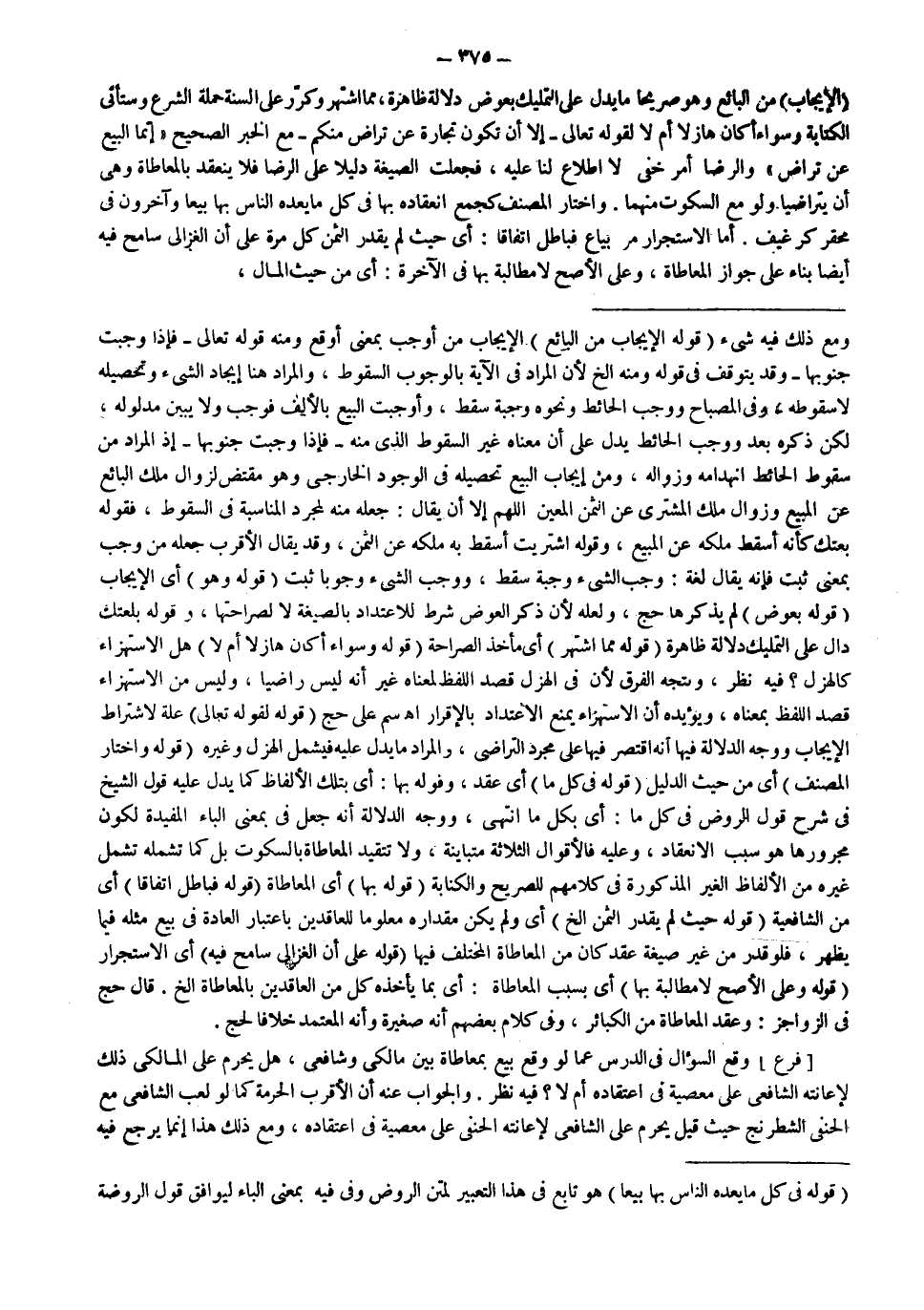 (الْإِيجَابُ) مِنْ الْبَائِعِ وَهُوَ صَرِيحًا مَا يَدُلُّ عَلَى التَّمْلِيكِ بِعِوَضٍ دَلَالَةً ظَاهِرَةً، مِمَّا اُشْتُهِرَ وَكُرِّرَ عَلَى أَلْسِنَةِ حَمَلَةِ الشَّرْعِ وَسَتَأْتِي الْكِتَابَةُ وَسَوَاءٌ أَكَانَ هَازِلًا أَمْ لَا لِقَوْلِهِ تَعَالَى {إِلا أَنْ تَكُونَ تِجَارَةً عَنْ تَرَاضٍ مِنْكُمْ} [النساء: 29] مَعَ الْخَبَرِ الصَّحِيحِ «إنَّمَا الْبَيْعُ عَنْ تَرَاضٍ» وَالرِّضَا أَمْرٌ خَفِيٌّ لَا اطِّلَاعَ لَنَا عَلَيْهِ، فَجُعِلَتْ الصِّيغَةُ دَلِيلًا عَلَى الرِّضَا فَلَا يَنْعَقِدُ بِالْمُعَاطَاةِ وَهِيَ أَنْ يَتَرَاضَيَا وَلَوْ مَعَ السُّكُوتِ مِنْهُمَا.