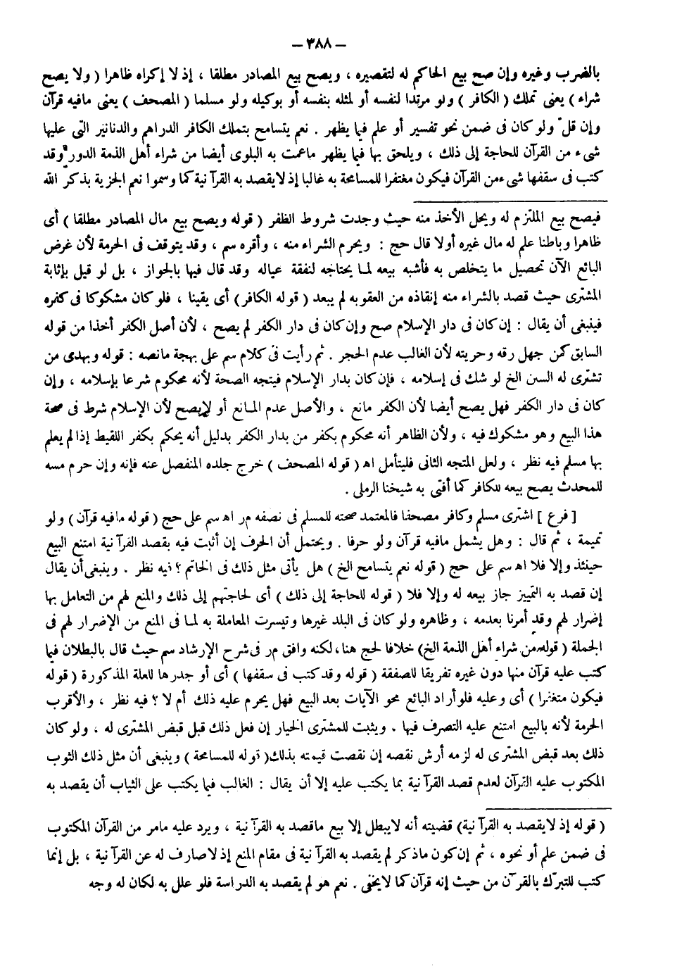 [فَرْعٌ] اشْتَرَى مُسْلِمٌ وَكَافِرٌ مُصْحَفًا فَالْمُعْتَمَدُ صِحَّتُهُ لِلْمُسْلِمِ فِي نِصْفِهِ مَرَّ اهـ سم عَلَى حَجّ (قَوْلُهُ: مَا فِيهِ قُرْآنٌ) وَلَوْ تَمِيمَةً، ثُمَّ قَالَ: وَهَلْ يَشْمَلُ مَا فِيهِ قُرْآنٌ وَلَوْ حَرْفًا.