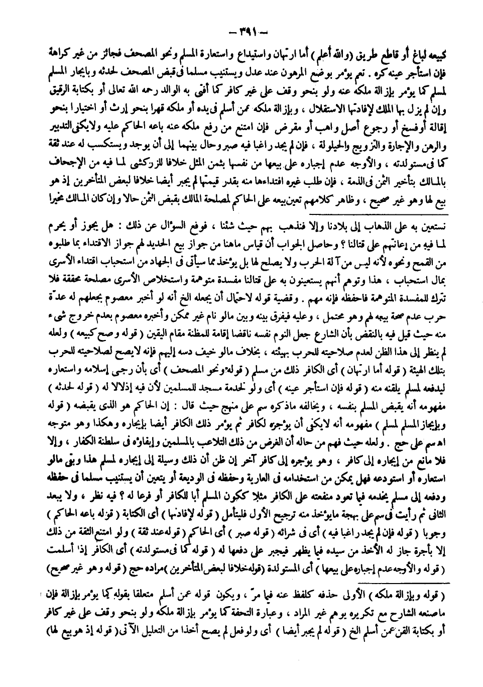ـــــــــــــــــــــــــــــSنَسْتَعِينُ بِهِ عَلَى الذَّهَابِ إلَى بِلَادِنَا، وَإِلَّا فَنَذْهَبُ بِهِمْ حَيْثُ شِئْنَا، فَوَقَعَ السُّؤَالُ عَنْ ذَلِكَ: هَلْ يَجُوزُ أَوْ يَحْرُمُ لِمَا فِيهِ مِنْ إعَانَتِهِمْ عَلَى قِتَالِنَا؟ وَحَاصِلُ الْجَوَابِ أَنَّ قِيَاسَ مَا هُنَا مِنْ جَوَازِ بَيْعِ الْحَدِيدِ لَهُمْ جَوَازُ الِافْتِدَاءِ بِمَا طَلَبُوهُ مِنْ الْقَمْحِ وَنَحْوِهِ؛ لِأَنَّهُ لَيْسَ مِنْ آلَةِ الْحَرْبِ وَلَا يَصْلُحُ لَهَا بَلْ يُؤْخَذُ مِمَّا سَيَأْتِي فِي الْجِهَادِ مِنْ اسْتِحْبَابِ افْتِدَاءِ الْأَسْرَى بِمَالٍ اسْتِحْبَابُ هَذَا وَتَوَهُّمُ أَنَّهُمْ يَسْتَعِينُونَ بِهِ عَلَى قِتَالِنَا مَفْسَدَةٌ مُتَوَهَّمَةٌ وَاسْتِخْلَاصُ الْأَسْرَى مَصْلَحَةٌ مُحَقَّقَةٌ فَلَا تَتْرُكُ لِلْمَفْسَدَةِ الْمُتَوَهَّمَةِ فَاحْفَظْهُ فَإِنَّهُ مُهِمٌّ.