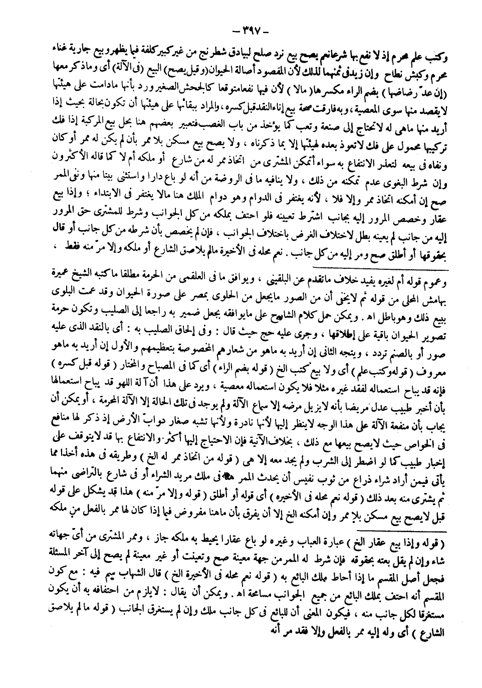 وَيُمْكِنُ حَمْلُ كَلَامِ الشَّارِحِ عَلَى مَا يُوَافِقُهُ بِجَعْلِ ضَمِيرِ بِهِ رَاجِعًا إلَى الصَّلِيبِ وَتَكُونُ حُرْمَةُ تَصْوِيرِ الْحَيَوَانِ بَاقِيَةٌ عَلَى إطْلَاقِهَا، وَجَرَى عَلَيْهِ حَجّ حَيْثُ قَالَ: وَفِي إلْحَاقِ الصَّلِيبِ بِهِ: أَيْ بِالنَّقْدِ الَّذِي عَلَيْهِ صُوَرٌ أَوْ بِالصَّنَمِ تَرَدُّدٌ، وَيَتَّجِهُ الثَّانِي إنْ أُرِيدَ بِهِ مَا هُوَ شِعَارُهُمْ الْمَخْصُوصَةُ بِتَعْظِيمِهِمْ وَالْأَوَّلُ إنْ أُرِيدَ بِهِ مَا هُوَ مَعْرُوفٌ (قَوْلُهُ: وَكُتُبِ عِلْمٍ) أَيْ وَلَا بَيْعَ كُتُبِ إلَخْ (قَوْلُهُ: بِضَمِّ الرَّاءِ) أَيْ كَمَا فِي الْمِصْبَاحِ وَالْمُخْتَارِ (قَوْلُهُ: قَبْلَ كَسْرِهِ) فَإِنَّهُ قَدْ يُبَاحُ اسْتِعْمَالُهُ لِفَقْدِ غَيْرِهِ مَثَلًا فَلَا يَكُونُ اسْتِعْمَالُهُ مَعْصِيَةً، وَيُرَدُّ عَلَى هَذَا أَنَّ آلَةَ اللَّهْوِ قَدْ يُبَاحُ اسْتِعْمَالُهَا بِأَنْ أَخْبَرَ طَبِيبٌ عَدْلٌ مَرِيضًا بِأَنَّهُ لَا يُزِيلُ مَرَضَهُ إلَّا سَمَاعُ الْآلَةِ وَلَمْ يُوجَدْ فِي تِلْكَ الْحَالَةِ إلَّا الْآلَةُ الْمُحَرَّمَةُ، أَوْ يُمْكِنُ أَنْ يُجَابَ بِأَنَّ مَنْفَعَةَ الْآلَةِ عَلَى هَذَا الْوَجْهِ لَا يُنْظَرُ إلَيْهَا؛ لِأَنَّهَا نَادِرَةٌ وَلِأَنَّهَا تُشْبِهُ صِغَارَ دَوَابِّ الْأَرْضِ إذْ ذَكَرَ لَهَا مَنَافِعَ فِي الْخَوَاصِّ حَيْثُ لَا يَصِحُّ بَيْعُهَا مَعَ ذَلِكَ، بِخِلَافِ الْآنِيَةِ فَإِنَّ الِاحْتِيَاجَ إلَيْهَا أَكْثَرُ وَالِانْتِفَاعُ بِهَا قَدْ لَا يَتَوَقَّفُ عَلَى إخْبَارِ طَبِيبٍ كَمَا لَوْ اُضْطُرَّ إلَى الشُّرْبِ وَلَمْ يَجِدْ مَعَهُ إلَّا هِيَ (قَوْلُهُ: مِنْ اتِّخَاذِ مَمَرٍّ لَهُ إلَخْ) وَطَرِيقُهُ فِي هَذِهِ أَخْذًا مِمَّا يَأْتِي فِيمَنْ أَرَادَ شِرَاءَ ذِرَاعٍ مِنْ ثَوْبٍ نَفِيسٍ أَنْ يُحْدِثَ الْمَمَرَّ هُنَا فِي مِلْكِ مَرِيدِ الشِّرَاءِ أَوْ فِي شَارِعٍ بِالتَّرَاضِي مِنْهُمَا ثُمَّ يَشْتَرِي مِنْهُ بَعْدَ ذَلِكَ (قَوْلُهُ: نَعَمْ مَحَلُّهُ فِي الْأَخِيرَةِ) أَيْ قَوْلُهُ أَوْ أَطْلَقَ (قَوْلُهُ: وَإِلَّا مَرَّ مِنْهُ) هَذَا قَدْ يُشْكِلُ عَلَى قَوْلِهِ قَبْلُ لَا يَصِحُّ بَيْعُ مَسْكَنٍ بِلَا مَمَرٍّ وَإِنْ أَمْكَنَهُ إلَخْ إلَّا أَنْ يُفَرَّقَ بِأَنَّ مَا هُنَا مَفْرُوضٌ فِيمَا إذَا كَانَ لَهَا مَمَرٌّ بِالْفِعْلِ مِنْ مِلْكِهِ