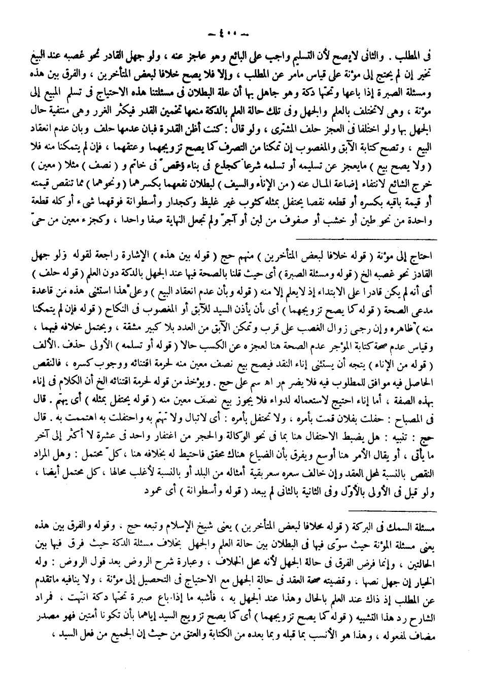 ـــــــــــــــــــــــــــــSاحْتَاجَ إلَى مُؤْنَةٍ (قَوْلُهُ: خِلَافًا لِبَعْضِ الْمُتَأَخِّرِينَ) مِنْهُمْ حَجّ (قَوْلُهُ: بَيْنَ هَذِهِ) الْإِشَارَةُ رَاجِعَةٌ لِقَوْلِهِ وَلَوْ جَهِلَ الْقَادِرُ نَحْوَ غَصْبِهِ إلَخْ (قَوْلُهُ: وَمَسْأَلَةِ الصُّبْرَةِ) أَيْ حَيْثُ قُلْنَا بِالصِّحَّةِ فِيهَا عِنْدَ الْجَهْلِ بِالدَّكَّةِ دُونَ الْعِلْمِ (قَوْلُهُ: حَلَفَ) أَيْ أَنَّهُ لَمْ يَكُنْ قَادِرًا عَلَى الِابْتِدَاءِ إذْ لَا يَعْلَمُ إلَّا مِنْهُ (قَوْلُهُ: وَبِأَنْ عَدَمَ انْعِقَادِ الْبَيْعِ) وَعَلَى هَذَا اسْتَثْنَى هَذِهِ مِنْ قَاعِدَةِ مُدَّعِي الصِّحَّةِ (قَوْلُهُ: كَمَا يَصِحُّ تَزْوِيجُهُمَا) أَيْ بِأَنْ يَأْذَنَ السَّيِّدُ لِلْآبِقِ أَوْ الْمَغْصُوبِ فِي النِّكَاحِ (قَوْلُهُ: فَإِنْ لَمْ يَتَمَكَّنَا مِنْهُ) ظَاهِرُهُ وَإِنْ رُجِيَ زَوَالُ الْغَصْبِ عَلَى قُرْبٍ وَتَمَكَّنَ الْآبِقُ مِنْ الْعَدَدِ بِلَا كَبِيرِ مَشَقَّةٍ، وَيَحْتَمِلُ خِلَافَهُ فِيهِمَا، وَقِيَاسُ عَدَمِ صِحَّةِ كِتَابَةِ الْمُؤَجَّرِ عَدَمُ الصِّحَّةِ هُنَا لِعَجْزِهِ عَنْ الْكَسْبِ حَالًا
