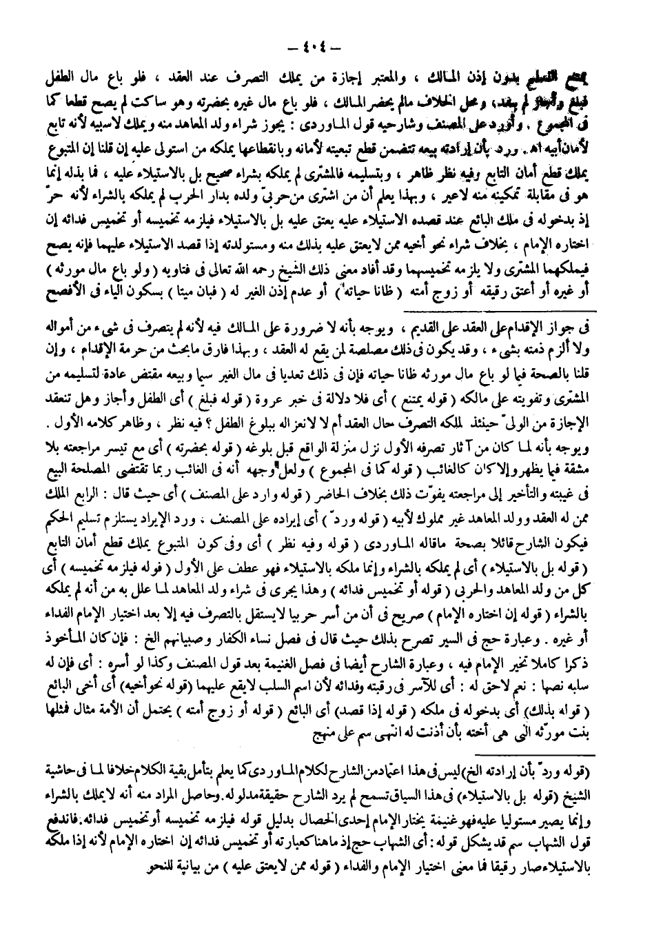 وَيُوَجَّهُ بِأَنَّهُ لَمَّا كَانَ مِنْ آثَارِ تَصَرُّفِهِ الْأَوَّلِ نَزَلَ مَنْزِلَةَ الْوَاقِعِ قَبْلَ بُلُوغِهِ (قَوْلُهُ: بِحَضْرَتِهِ) أَيْ مَعَ تَيَسُّرِ مُرَاجَعَتِهِ بِلَا مَشَقَّةٍ فِيمَا يَظْهَرُ وَإِلَّا كَانَ كَالْغَائِبِ (قَوْلُهُ: كَمَا فِي الْمَجْمُوعِ) وَلَعَلَّ وَجْهَهُ أَنَّهُ فِي الْغَائِبِ رُبَّمَا تَقْتَضِي الْمَصْلَحَةُ الْبَيْعَ فِي غِيبَتِهِ وَالتَّأْخِيرُ إلَى مُرَاجَعَتِهِ يُفَوِّتُ ذَلِكَ بِخِلَافِ الْحَاضِرِ (قَوْلُهُ: وَارِدٌ عَلَى الْمُصَنِّفِ) أَيْ حَيْثُ قَالَ: الرَّابِعُ الْمِلْكُ مِمَّنْ لَهُ الْعَقْدُ وَوَلَدُ الْمُعَاهَدِ غَيْرُ مَمْلُوكٍ لِأَبِيهِ (قَوْلُهُ: وَرُدَّ) أَيْ إيرَادُهُ عَلَى الْمُصَنِّفِ، وَرَدُّ الْإِيرَادِ يَسْتَلْزِمُ تَسْلِيمَ الْحُكْمِ فَيَكُونُ الشَّارِحُ قَائِلًا بِصِحَّةِ مَا قَالَهُ الْمَاوَرْدِيُّ (قَوْلُهُ: وَفِيهِ نَظَرٌ) أَيْ وَفِي كَوْنِ الْمَتْبُوعِ يَمْلِكُ قَطْعَ أَمَانِ التَّابِعِ (قَوْلُهُ: بَلْ بِالِاسْتِيلَاءِ) أَيْ لَمْ يَمْلِكْهُ بِالشِّرَاءِ وَإِنَّمَا مَلَكَهُ بِالِاسْتِيلَاءِ فَهُوَ عَطْفٌ عَلَى الْأَوَّلِ (قَوْلُهُ: فَيَلْزَمُهُ تَخْمِيسُهُ) أَيْ كُلٌّ مِنْ وَلَدِ الْمُعَاهَدِ وَالْحَرْبِيِّ (قَوْلُهُ: أَوْ تَخْمِيسُ فِدَائِهِ) وَهَذَا يَجْرِي فِي شِرَاءِ وَلَدِ الْمُعَاهَدِ لِمَا عَلَّلَ بِهِ مِنْ أَنَّهُ لَمْ يَمْلِكْهُ بِالشِّرَاءِ (قَوْلُهُ: إنْ اخْتَارَهُ الْإِمَامُ) صَرِيحٌ فِي أَنَّ مَنْ أَسَرَ حَرْبِيًّا لَا يَسْتَقِلُّ بِالتَّصَرُّفِ فِيهِ إلَّا بَعْدَ اخْتِيَارِ الْإِمَامِ الْفِدَاءَ أَوْ غَيْرَهُ.