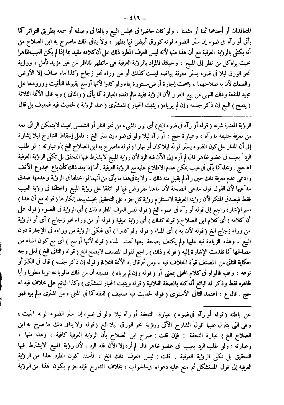 ـــــــــــــــــــــــــــــSالرُّؤْيَةُ الْمُعْتَبَرَةُ شَرْعًا (قَوْلُهُ: أَوْ رَآهُ فِي ضَوْءٍ إلَخْ) أَيْ نُورٍ نَاشِئٍ مِنْ نَحْوِ النَّارِ أَوْ الشَّمْسِ بِحَيْثُ لَا يَتَمَكَّنُ الرَّائِي مَعَهُ مِنْ مَعْرِفَةِ حَقِيقَةِ مَا رَآهُ، وَعِبَارَةُ حَجّ: أَوْ رَآهُ لَيْلًا وَلَوْ فِي ضَوْءٍ إنْ سَتَرَ إلَخْ، فَلَعَلَّ إسْقَاطَ الشَّارِحِ لَيْلًا إشَارَةٌ إلَى أَنَّ الْمَدَارَ عَلَى كَوْنِ الضَّوْءِ يَسْتُرُ لَوْنَهُ لَيْلًا كَانَ أَوْ نَهَارًا (قَوْلُهُ: مَا صَرَّحَ بِهِ ابْنُ الصَّلَاحِ إلَخْ) وَعِبَارَتُهُ: لَوْ طَلَبَ الرَّدَّ بِعَيْبٍ فِي عُضْوٍ ظَاهِرٍ قَالَ لَمْ أَرَهُ إلَى الْآنَ فَلَهُ الرَّدُّ؛ لِأَنَّ رُؤْيَةَ الْمَبِيعِ لَا يُشْتَرَطُ فِيهَا التَّحَقُّقُ بَلْ تَكْفِي الرُّؤْيَةُ الْعُرْفِيَّةُ اهـ حَجّ.