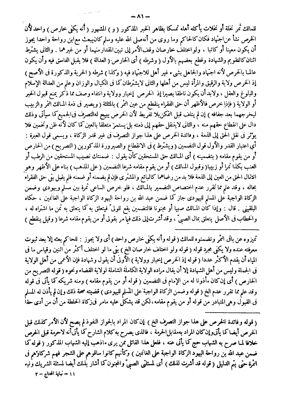 قَوْلُهُ: وَفَائِدَةُ الْخَرْصِ عَلَى هَذَا جَوَازُ التَّصَرُّفِ إلَخْ) إنْ كَانَ الْمُرَادُ بِالْجَوَازِ النُّفُوذَ لَمْ يَصِحَّ لِأَنَّ الْأَمْرَ كَذَلِكَ قَبْلَ الْخَرْصِ أَيْضًا كَمَا يَأْتِي وَإِنْ كَانَ الْمُرَادُ بِهِ مُقَابِلَ الْحُرْمَةِ، فَاَلَّذِي يُصَرِّحُ بِهِ كَلَامُ الشَّارِحِ كَمَا يَأْتِي أَنَّهُ لَا حُرْمَةَ قَبْلَ الْخَرْصِ خِلَافًا لِمَا صَرَّحَ بِهِ الشِّهَابُ حَجّ كَمَا يَأْتِي عَنْهُ، فَلَعَلَّ هَذَا الْقَائِلَ مِمَّنْ يَرَى مَا ذَهَبَ إلَيْهِ الشِّهَابُ الْمَذْكُورُ (قَوْلُهُ كَمَا ضَمَّنَ عَبْدُ اللَّهِ بْنُ رَوَاحَةَ الْيَهُودَ الزَّكَاةَ الْوَاجِبَةَ عَلَى الْغَانِمِينَ) وَكَأَنَّهُمْ كَانُوا سَاقُوهُمْ عَلَى الشَّجَرِ فَهُمْ شُرَكَاؤُهُمْ فِي الثَّمَرَةِ حَتَّى يَتِمَّ الدَّلِيلُ (قَوْلُهُ: قَدْ أَشَرْت لِذَلِكَ) أَيْ لِمَسْأَلَتَيْ الصَّبِيِّ وَالْمَجْنُونِ كَمَا أَشَارَ بِذَلِكَ أَيْضًا لِمَسْأَلَةِ الشَّرِيكِ وَنَبَّهَ