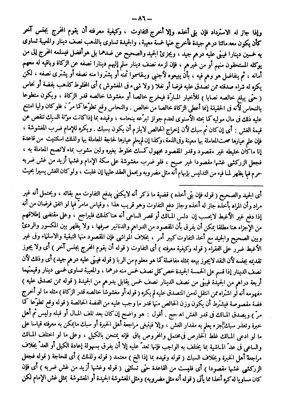 وَإِذَا جَازَ لَهُ الِاسْتِرْدَادُ فَإِنْ بَقِيَ أَخَذَهُ، وَإِلَّا أَخْرَجَ التَّفَاوُتَ، وَكَيْفِيَّةُ مَعْرِفَتِهِ أَنْ يُقَوَّمَ الْمُخْرَجُ بِجِنْسٍ آخَرَ كَأَنْ يَكُونَ مَعَهُ مِائَتَا دِرْهَمٍ جَيِّدَةٍ فَأَخْرَجَ عَنْهَا خَمْسَةً مَعِيبَةً، وَالْجَيِّدَةُ تُسَاوِي بِالذَّهَبِ نِصْفَ دِينَارٍ، وَالْمَعِيبَةُ تُسَاوِي بِهِ خَمْسِينَ دِينَارًا فَيَبْقَى عَلَيْهِ دِرْهَمٌ جَيِّدٌ، وَيُجْزِئُ الْجَيِّدُ وَالصَّحِيحُ عَنْ ضِدِّهِمَا بَلْ هُوَ أَفْضَلُ فَيُسَلِّمُهُ الْمُخْرَجَ إلَى مَنْ يُوَكِّلُهُ الْمُسْتَحِقُّونَ مِنْهُمْ أَوْ مِنْ غَيْرِهِمْ، فَإِنْ لَزِمَهُ نِصْفُ دِينَارٍ سَلَّمَ إلَيْهِمْ دِينَارًا نِصْفَهُ عَنْ الزَّكَاةِ وَبَاقِيَهُ لَهُ مَعَهُمْ أَمَانَةً، ثُمَّ يَتَفَاضَلُ هُوَ وَهُمْ فِيهِ، بِأَنْ يَبِيعُوهُ لِأَجْنَبِيٍّ وَيُقَاسِمُوا ثَمَنَهُ أَوْ يَشْتَرُوا مِنْهُ نِصْفَهُ أَوْ يَشْتَرِيَ نِصْفَهُ، لَكِنْ يُكْرَهُ لَهُ شِرَاءُ صَدَقَتِهِ مِمَّنْ تَصَدَّقَ عَلَيْهِ فَرْضًا أَوْ نَفْلًا (وَلَا شَيْءَ فِي) (الْمَغْشُوشِ) أَيْ الْمَخْلُوطِ كَذَهَبٍ بِفِضَّةٍ أَوْ نُحَاسٍ (حَتَّى يَبْلُغَ خَالِصُهُ نِصَابًا) لِلْأَخْبَارِ الْمَارَّةِ فَيُخْرِجُ خَالِصًا أَوْ مَغْشُوشًا خَالِصُهُ قَدْرُ الزَّكَاةِ، وَيَكُونُ مُتَطَوِّعًا بِالنُّحَاسِ؛ لِأَنَّهُ فِي الْحَقِيقَةِ إنَّمَا أَعْطَى الزَّكَاةَ خَالِصًا مِنْ خَالِصٍ.