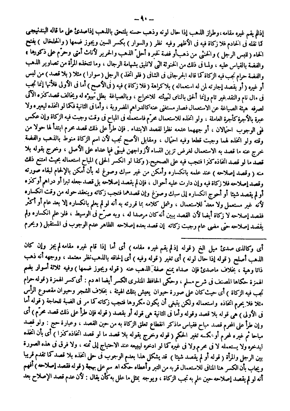إذَا لَمْ يَقُمْ غَيْرُهُ مَقَامَهُ، وَطِرَازُ الذَّهَبِ إذَا حَالَ لَوْنُهُ وَذَهَبَ حُسْنُهُ يَلْتَحِقُ بِالذَّهَبِ إذَا صَدِئَ عَلَى مَا قَالَهُ الْبَنْدَنِيجِيُّ كَمَا نَقَلَهُ فِي الْخَادِمِ فَلَا زَكَاةَ فِيهِ فِي الْأَظْهَرِ وَفِيهِ نَظَرٌ (وَالسِّوَارُ) بِكَسْرِ السِّينِ وَيَجُوزُ ضَمُّهَا (وَالْخَلْخَالُ) بِفَتْحِ الْخَاءِ (لِلُبْسِ الرَّجُلِ) وَالْخُنْثَى مِنْ ذَهَبٍ أَوْ فِضَّةٍ لِخَبَرِ «أُحِلَّ الذَّهَبُ وَالْحَرِيرُ لِإِنَاثِ أُمَّتِي وَحُرِّمَ عَلَى ذُكُورِهَا» وَالْفِضَّةُ بِالْقِيَاسِ عَلَيْهِ، وَلِمَا فِي ذَلِكَ مِنْ الْخُنُوثَةِ الَّتِي لَا تَلِيقُ بِشَهَامَةِ الرِّجَالِ، وَمَا تَتَّخِذُهُ الْمَرْأَةُ مِنْ تَصَاوِيرِ الذَّهَبِ وَالْفِضَّةِ حَرَامٌ تَجِبُ فِيهِ الزَّكَاةُ كَمَا قَالَهُ الْجُرْجَانِيُّ فِي الشَّافِي (فَلَوْ) (اتَّخَذَ) الرَّجُلُ (سِوَارًا) مَثَلًا (بِلَا قَصْدٍ) مِنْ لُبْسٍ أَوْ غَيْرِهِ (أَوْ بِقَصْدِ إجَارَتِهِ لِمَنْ لَهُ اسْتِعْمَالُهُ) بِلَا كَرَاهَةٍ (فَلَا زَكَاةَ) فِيهِ (فِي الْأَصَحِّ) أَمَّا فِي الْأُولَى فَلِأَنَّهَا إنَّمَا تَجِبُ فِي مَالٍ نَامٍ وَالنَّقْدُ غَيْرُ نَامٍ، وَإِنَّمَا أُلْحِقَ بِالنَّامِي لِتَهْيِئَتِهِ لِلْإِخْرَاجِ، وَبِالصِّيَاغَةِ بَطَلَ تَهَيُّؤُهُ لَهُ، وَيُخَالِفُ قَصْدَ كَنْزِهِ الْآتِي لِصَرْفِهِ هَيْئَةَ الصِّيَاغَةِ عَنْ الِاسْتِعْمَالِ فَصَارَ مُسْتَغْنًى عَنْهُ كَالدَّرَاهِمِ الْمَضْرُوبَةِ، وَأَمَّا فِي الثَّانِيَةِ فَكَمَا لَوْ اتَّخَذَهُ لِيُعِيرَهُ وَلَا عِبْرَةَ بِالْأُجْرَةِ كَأُجْرَةِ الْعَامِلَةِ، وَلَوْ اتَّخَذَهُ لِاسْتِعْمَالٍ مُحَرَّمٍ فَاسْتَعْمَلَهُ فِي الْمُبَاحِ فِي وَقْتٍ وَجَبَتْ فِيهِ الزَّكَاةُ، وَإِنْ عُكِسَ فَفِي الْوُجُوبِ احْتِمَالَانِ، أَوْجَهُهُمَا عَدَمُهُ نَظَرًا لِقَصْدِ الِابْتِدَاءِ.