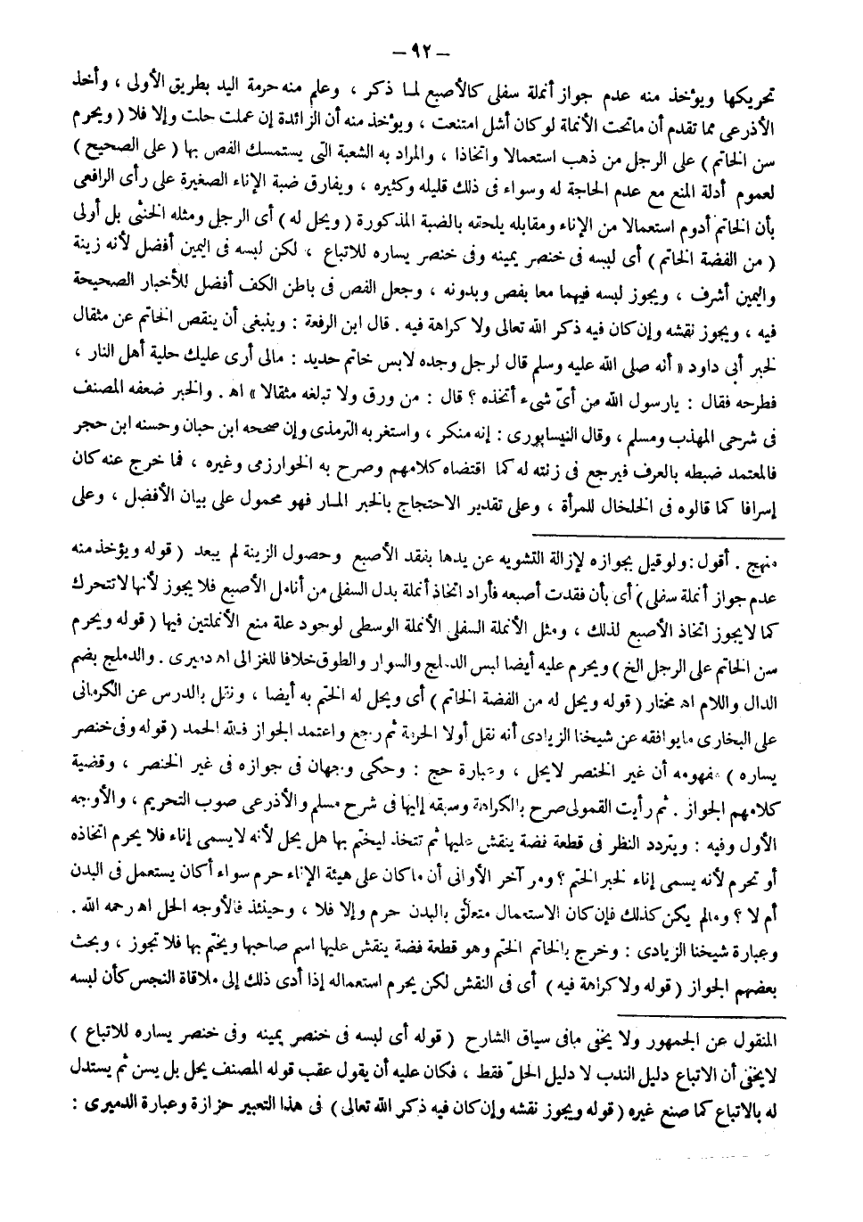 ـــــــــــــــــــــــــــــQالْمَنْقُولُ عَنْ الْجُمْهُورِ وَلَا يَخْفَى مَا فِي سِيَاقِ الشَّارِحِ (قَوْلُهُ: أَيْ لَبِسَهُ فِي خِنْصَرِ يَمِينِهِ وَفِي خِنْصَرِ يَسَارِهِ لِلِاتِّبَاعِ) لَا يَخْفَى أَنَّ الِاتِّبَاعَ دَلِيلُ النَّدْبِ لَا دَلِيلُ الْحِلِّ فَقَطْ، فَكَانَ عَلَيْهِ أَنْ يَقُولَ عَقِبَ قَوْلِ الْمُصَنِّفِ يَحِلُّ بَلْ يُسَنُّ ثُمَّ يُسْتَدَلُّ لَهُ بِالِاتِّبَاعِ كَمَا صَنَعَ غَيْرُهُ (قَوْلُهُ: وَيَجُوزُ نَقْشُهُ وَإِنْ كَانَ فِيهِ ذِكْرُ اللَّهِ تَعَالَى) فِي هَذَا التَّعْبِيرِ حَزَازَةٌ وَعِبَارَةُ الدَّمِيرِيِّ: