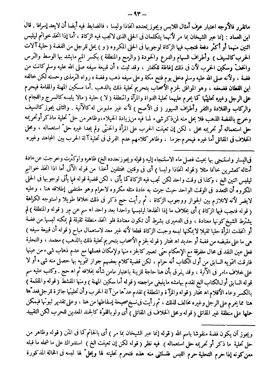 (قَوْلُهُ: وَالْمِنْطَقَةِ) لَمْ يَشْتَرِطْ الشَّيْخُ كَوْنَهَا مُعْتَادَةً، وَفِي الدَّمِيرِيِّ بِشَرْطِ أَنْ تَكُونَ مُعْتَادَةً فَلَوْ اتَّخَذَ مِنْطَقَةً ثَقِيلَةً لَمْ يُمْكِنْهُ لُبْسُهَا مِنْ فِضَّةٍ، أَوْ اتَّخَذَتْ الْمَرْأَةُ حُلِيًّا ثَقِيلًا لَا يُمْكِنُهَا لُبْسُهُ وَجَبَتْ الزَّكَاةُ قَطْعًا؛ لِأَنَّهُ غَيْرُ مُعَدٍّ لِاسْتِعْمَالٍ مُبَاحٍ (قَوْلُهُ: أَنَّ قَبِيعَةَ سَيْفِهِ) هِيَ مَا عَلَى مِقْبَضِهِ مِنْ فِضَّةٍ أَوْ حَدِيدٍ اهـ مُخْتَارٌ (قَوْلُهُ: لِجَزْمِ الْأَصْحَابِ بِتَحْرِيمِ تَحْلِيَةِ ذَلِكَ بِالذَّهَبِ) مُعْتَمَدٌ، وَالتَّحْلِيَةُ فِعْلُ عَيْنِ النَّقْدِ فِي مَحَالَّ مُتَفَرِّقَةٍ مَعَ الْإِحْكَامِ حَتَّى تَصِيرَ كَالْجُزْءِ مِنْهَا، وَلِإِمْكَانِ فَصْلِهَا مَعَ عَدَمِ ذَهَابِ شَيْءٍ مِنْ عَيْنِهَا فَارَقَتْ التَّمْوِيهَ السَّابِقَ مِنْ أَوَّلِ الْكِتَابِ أَنَّهُ حَرَامٌ، لَكِنَّ قَضِيَّةَ كَلَامِ بَعْضِهِمْ جَوَازٌ لِتَمْوِيهٍ بِهَا حَصَلَ مِنْهُ شَيْءٌ أَوْ لَا عَلَى خِلَافِ مَا مَرَّ فِي الْآنِيَةِ، وَقَدْ يُفَرَّقُ بِأَنَّ هُنَا حَاجَةً لِلزِّينَةِ بِاعْتِبَارِ مَا مِنْ شَأْنِهِ بِخِلَافِهِ ثَمَّ اهـ حَجّ.
