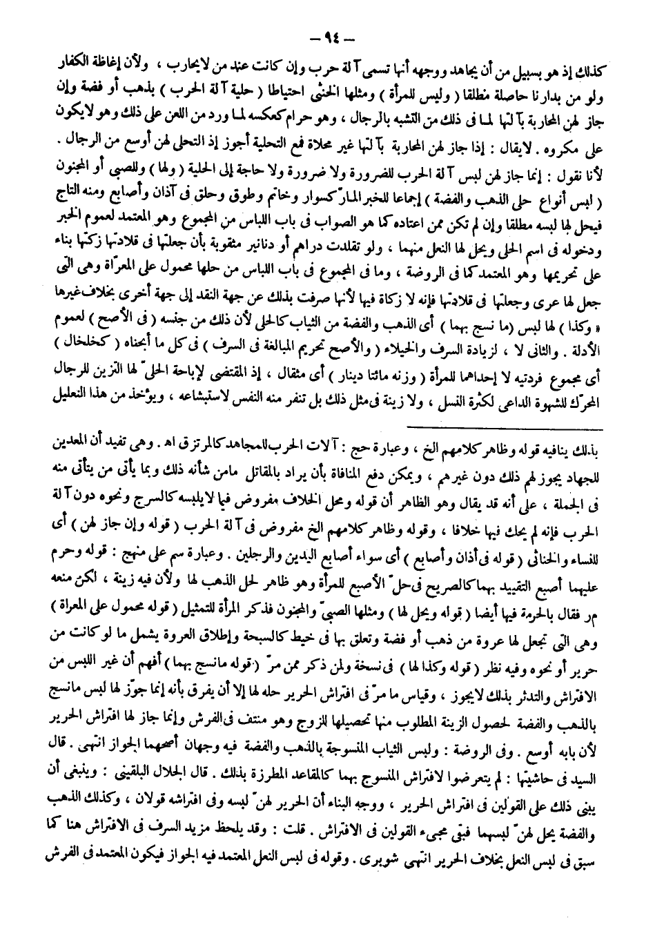 وَهِيَ تُفِيدُ أَنَّ الْمُعَدِّينَ لِلْجِهَادِ يَجُوزُ لَهُمْ ذَلِكَ دُونَ غَيْرِهِمْ، وَيُمْكِنُ دَفْعُ الْمُنَافَاةِ بِأَنْ يُرَادَ بِالْمُقَاتِلِ مَا مِنْ شَأْنِهِ ذَلِكَ، وَبِمَا يَأْتِي مَنْ يَتَأَتَّى مِنْهُ فِي الْجُمْلَةِ، عَلَى أَنَّهُ قَدْ يُقَالُ وَهُوَ الظَّاهِرُ أَنَّ قَوْلَهُ وَمَحَلَّ الْخِلَافِ مَفْرُوضٌ فِيمَا لَا يَلْبَسُهُ كَالسَّرْجِ وَنَحْوِهِ دُونَ آلَةِ الْحَرْبِ، فَإِنَّهُ لَمْ يَحْكِ فِيهَا خِلَافًا، وَقَوْلُهُ وَظَاهِرُ كَلَامِهِمْ إلَخْ مَفْرُوضٌ فِي آلَةِ الْحَرْبِ (قَوْلُهُ: وَإِنْ جَازَ لَهُنَّ) أَيْ لِلنِّسَاءِ وَالْخَنَاثَى (قَوْلُهُ: فِي أَذَانٍ وَأَصَابِعَ) أَيْ سَوَاءٌ أَصَابِعُ الْيَدَيْنِ وَالرِّجْلَيْنِ.