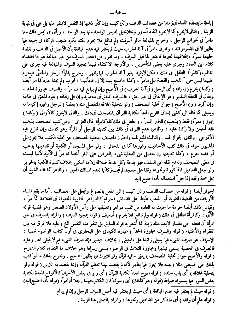 أَمَّا مَا يَقَعُ لِنِسَاءِ الْأَرْيَافِ مِنْ الْفِضَّةِ الْمَثْقُوبَةِ أَوْ الذَّهَبِ الْمَخِيطِ عَلَى الْقُمَاشِ فَحَرَامٌ كَالدَّرَاهِمِ الْمَثْقُوبَةِ الْمَجْعُولَةِ فِي الْقِلَادَةِ كَمَا مَرَّ، وَقِيَاسُ ذَلِكَ أَيْضًا حُرْمَةُ مَا جَرَتْ بِهِ الْعَادَةُ مِنْ ثَقْبِ دَرَاهِمَ وَتَعْلِيقِهَا عَلَى رَأْسِ الْأَوْلَادِ الصِّغَارِ وَهُوَ قَضِيَّةُ قَوْلِهِ الْآتِي: وَكَالْمَرْأَةِ الطِّفْلُ فِي ذَلِكَ (قَوْلُهُ: وَلَمْ تُبَالِغْ فَلَا يَحْرُمُ) ضَعِيفٌ (قَوْلُهُ بِمُجَرَّدِ السَّرَفِ) وَالْمُرَادُ بِالسَّرَفِ فِي حَقِّ الْمَرْأَةِ أَنْ تَفْعَلَهُ عَلَى مِقْدَارٍ لَا يُعَدُّ مِثْلُهُ زِينَةً كَمَا أَشْعَرَ بِهِ قَوْلُهُ السَّابِقُ بَلْ تَنْفِرُ مِنْهُ النَّفْسُ إلَخْ، وَعَلَيْهِ فَلَا فَرْقَ فِيهِ بَيْنَ الْفُقَرَاءِ وَالْأَغْنِيَاءِ (قَوْلُهُ: وَالسَّرَفُ مُجَاوَزَةُ الْحَدِّ) عِبَارَةُ الْكَرْمَانِيِّ عَلَى الْبُخَارِيِّ فِي أَوَّلِ كِتَابِ الْوُضُوءِ نَصُّهَا: الْإِسْرَافُ هُوَ صَرْفُ الشَّيْءِ فِيمَا يَنْبَغِي زَائِدًا عَلَى مَا يَنْبَغِي، بِخِلَافِ التَّبْذِيرِ فَإِنَّهُ صَرْفُ الشَّيْءِ فِيمَ لَا يَنْبَغِي اهـ.