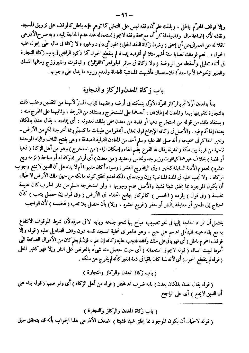 (بَابُ زَكَاةِ الْمَعْدِنِ وَالرِّكَازِ وَالتِّجَارَةِ) (قَوْلُهُ لِاحْتِمَالِ أَنْ يَكُونَ الْمَوْجُودُ مِمَّا يَخْلَقُ شَيْئًا فَشَيْئًا) ضَعَّفَ الْأَذْرَعِيُّ هَذَا الْجَوَابَ بِأَنَّهُ قَدْ يَتَحَقَّقُ سَبْقُ