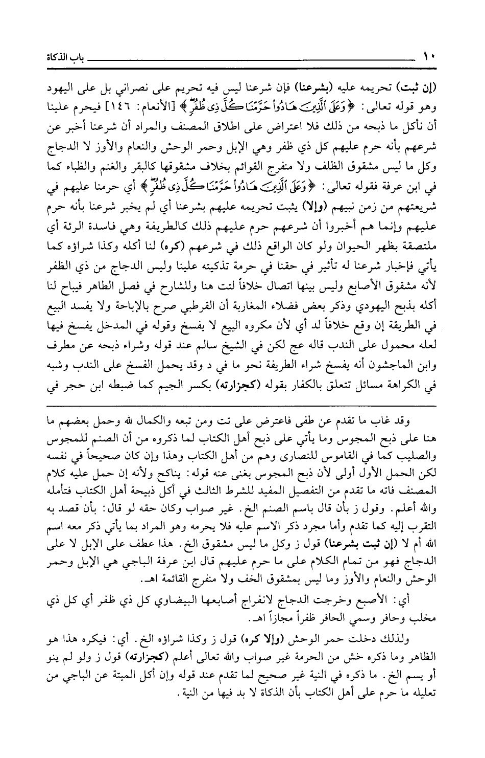 ولذلك دخلت حمر الوحش (وإلا كره) قول ز وكذا شراؤه الخ. أي: فيكره هذا هو الظاهر وما ذكره خش من الحرمة غير صواب والله تعالى أعلم (كجزارته) قول ز ولو لم ينو أو يسم الخ. ما ذكره في النية غير صحيح لما تقدم عند قوله وإن أكل الميتة عن الباجي من تعليله ما حرم على أهل الكتاب بأن الذكاة لا بد فيها من النية.