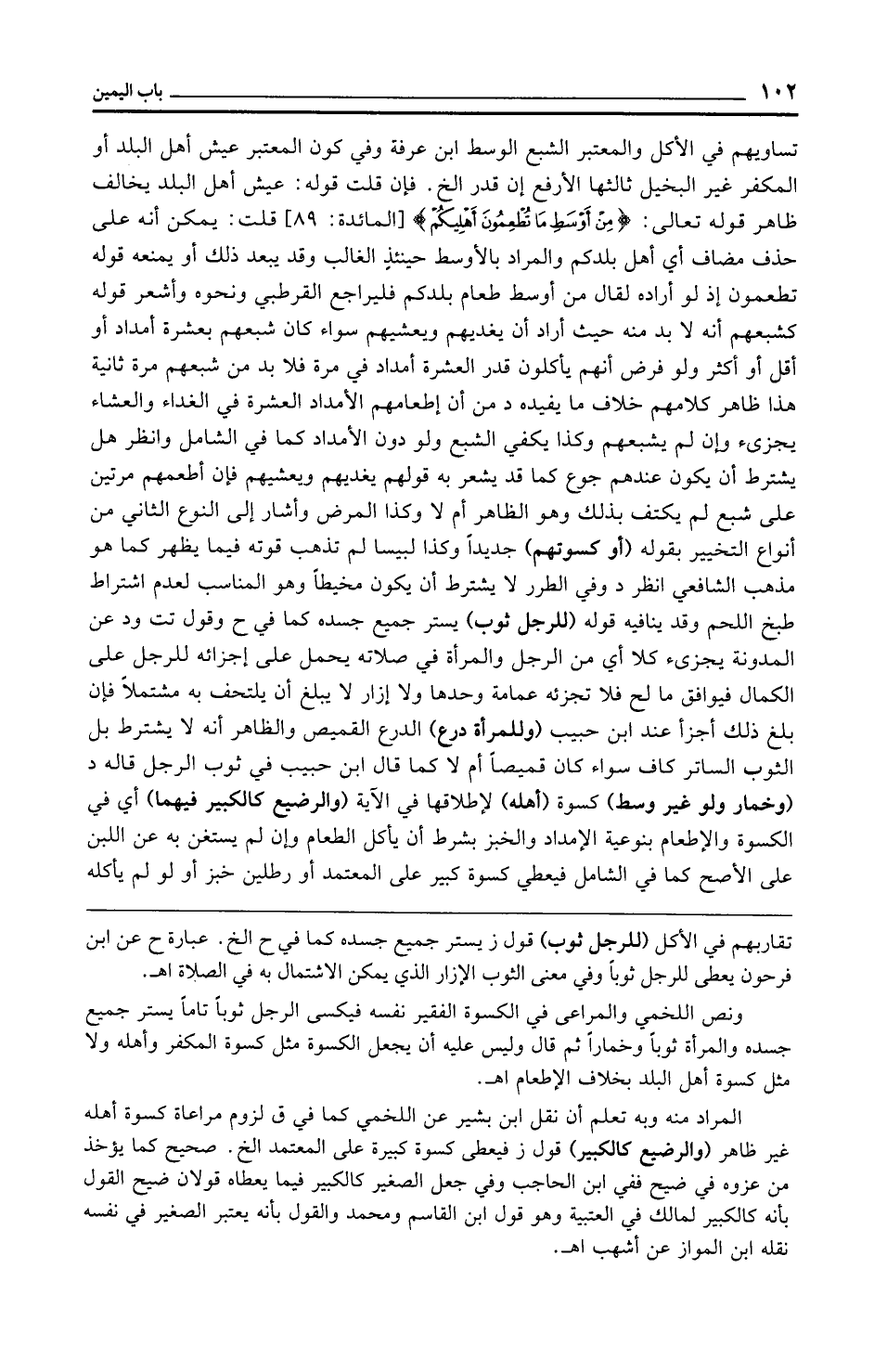تساويهم في الأكل والمعتبر الشبع الوسط ابن عرفة وفي كون المعتبر عيش أهل البلد أو المكفر غير البخيل ثالثها الأرفع إن قدر الخ. فإن قلت قوله: عيش أهل البلد يخالف ظاهر قوله تعالى: {مِنْ أَوْسَطِ مَا تُطْعِمُونَ أَهْلِيكُمْ} [المائدة: 89] قلت: يمكن أنه على حذف مضاف أي أهل بلدكم والمراد بالأوسط حينئذٍ الغالب وقد يبعد ذلك أو يمنعه قوله تطعمون إذ لو أراده لقال من أوسط طعام بلدكم فليراجع القرطبي ونحوه وأشعر قوله كشبعهم أنه لا بد منه حيث أراد أن يغديهم ويعشيهم سواء كان شبعهم بعشرة أمداد أو أقل أو أكثر ولو فرض أنهم يأكلون قدر العشرة أمداد في مرة فلا بد من شبعهم مرة ثانية هذا ظاهر كلامهم خلاف ما يفيده د من أن إطعامهم الأمداد العشرة في الغداء والعشاء يجزئ وإن لم يشبعهم وكذا يكفي الشبع ولو دون الأمداد كما في الشامل وانظر هل يشترط أن يكون عندهم جوع كما قد يشعر به قولهم يغديهم ويعشيهم فإن أطعمهم مرتين على شبع لم يكتف بذلك وهو الظاهر أم لا وكذا المرض وأشار إلى النوع الثاني من أنواع التخيير بقوله (أو كسوتهم) جديدًا وكذا لبيسا لم تذهب قوته فيما يظهر كما هو مذهب الشافعي انظر د وفي الطرر لا يشترط أن يكون مخيطًا وهو المناسب لعدم اشتراط طبخ اللحم وقد ينافيه قوله (للرجل ثوب) يستر جميع جسده كما في ح وقول تت ود عن المدونة يجزئ كلا أي من الرجل والمرأة في صلاته يحمل على إجزائه للرجل على الكمال فيوافق ما لح فلا تجزئه عمامة وحدها ولا إزار لا يبلغ أن يلتحف به مشتملًا فإن بلغ ذلك أجزأ عند ابن حبيب (وللمرأة درع) الدرع القميص والظاهر أنه لا يشترط بل الثوب الساتر كاف سواء كان قميصًا أم لا كما قال ابن حبيب في ثوب الرجل قاله د (وخمار ولو غير وسط) كسوة (أهله) لإطلاقها في الآية (والرضيع كالكبير فيهما) أي في الكسوة والإطعام بنوعية الإمداد والخبر بشرط أن يأكل الطعام وإن لم يستغن به عن اللبن على الأصح كما في الشامل فيعطي كسوة كبير على المعتمد أو رطلين خبز أو لو لم يأكله