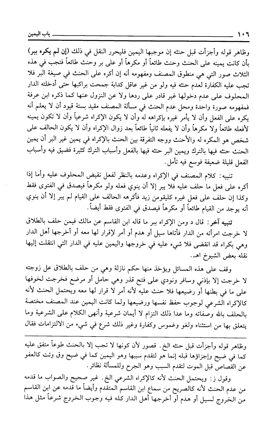 وقف على هذه المسائل ويؤخذ منها حكم نازلة وهي من حلف بالطلاق على زوجته لا خرجت إلا بإذني وسافر ونودي على فتح قذر وهي حامل أو مرضع فخرجت لخوفها على ما في بطنها أو رضيعها فلا حنث عليه لأنه أمر لا قرار لها معه ويحتمل الحنث لأنه كالإكراه الشرعي لوجوب حفظ نفسها ورضيعها ولما كانت اليمين عند المصنف مختصة بالحلف بالله وصفاته وما عدا ذلك التزام لا أيمان شرعية وأنهى الكلام على الشرعية وما يتعلق بها من استثناء ولغو وغموس وكفارة وغير ذلك شرع في شيء من الالتزامات فقال
